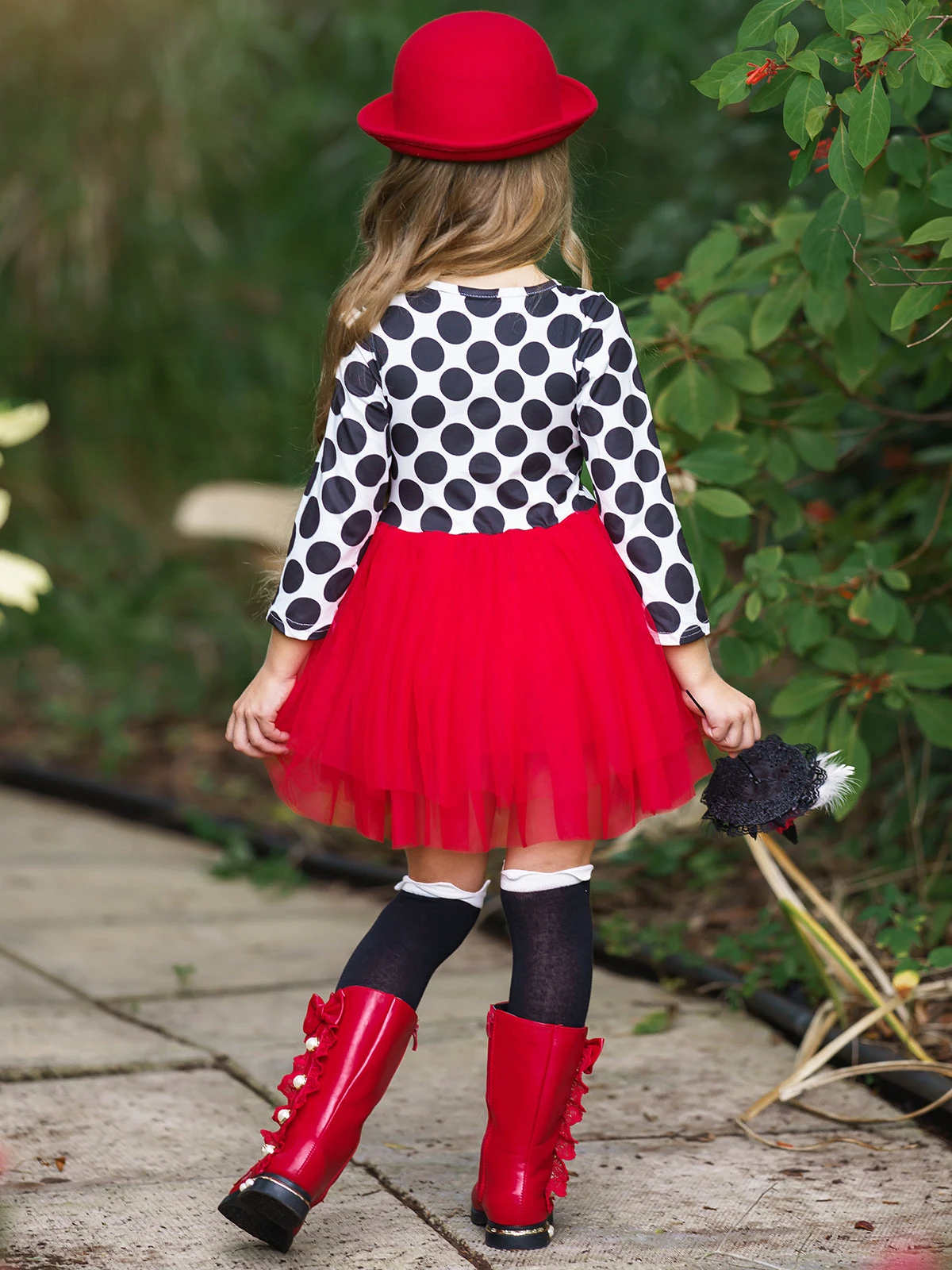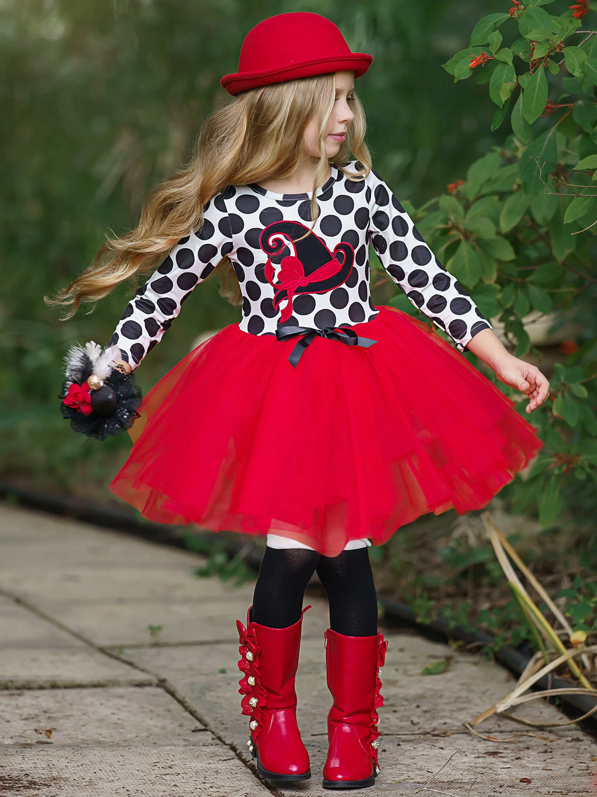 - Long-sleeve tutu dress with polka dot bodice, witch hat applique, bow accent, and gathered tulle skirt
