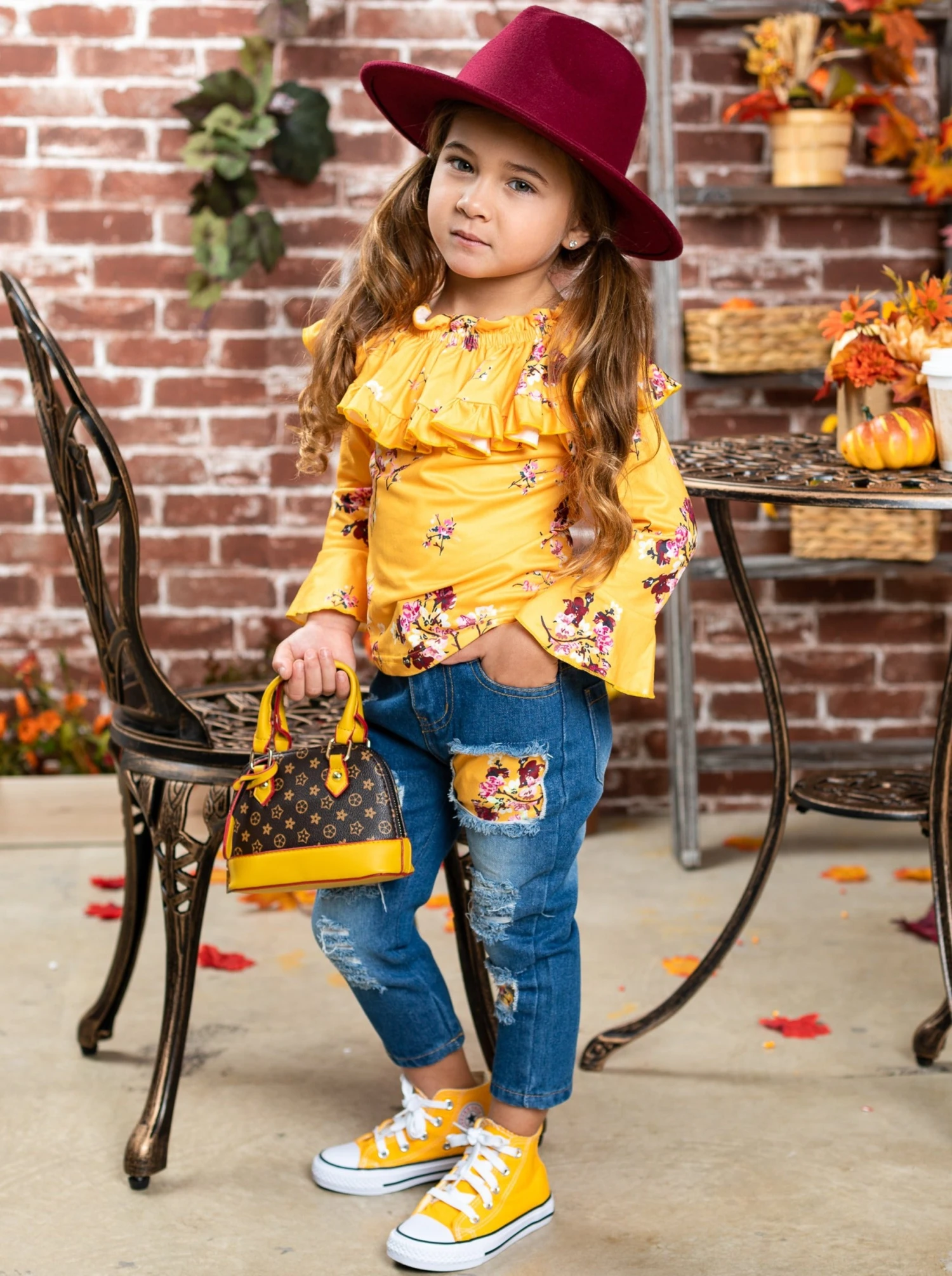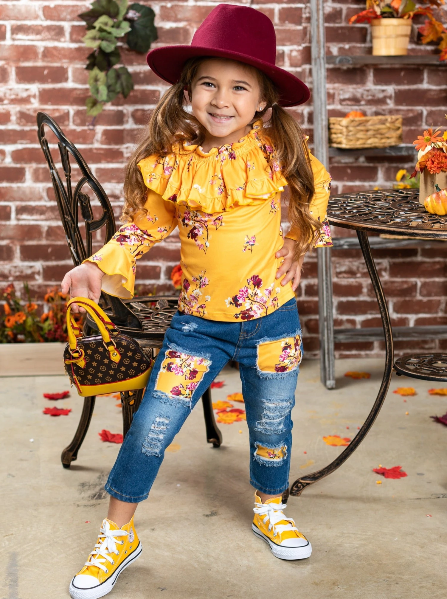 - You GROW girl! You’re going to leave them stunned as you wear this top and jeans set. Let your confidence bloom with ruffle bib collars, bell sleeves, and roomy, distressed denim with trendy floral pattern patches that perfectly match the top.Â