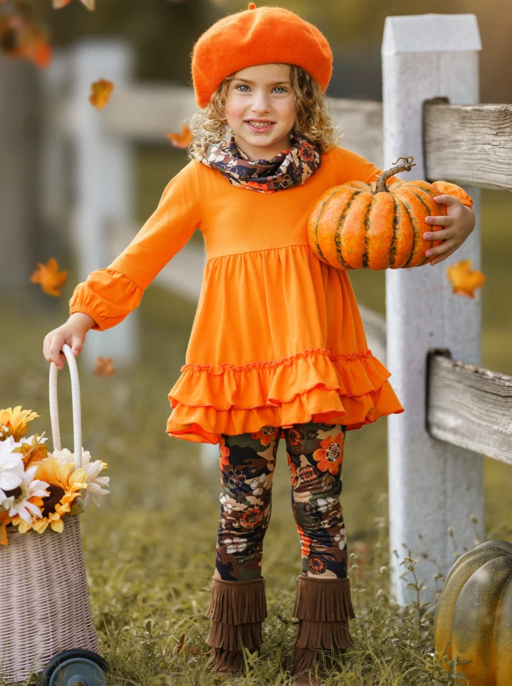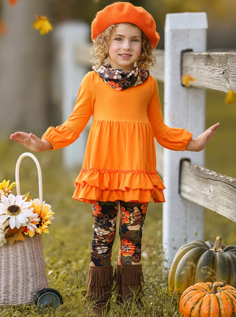 - Our orange floral camo print three-piece legging set is perfect for Fall! The flowy ruffle tunic, matching leggings and scarf, and festive design makes getting dressed easy and looking cute effortless.