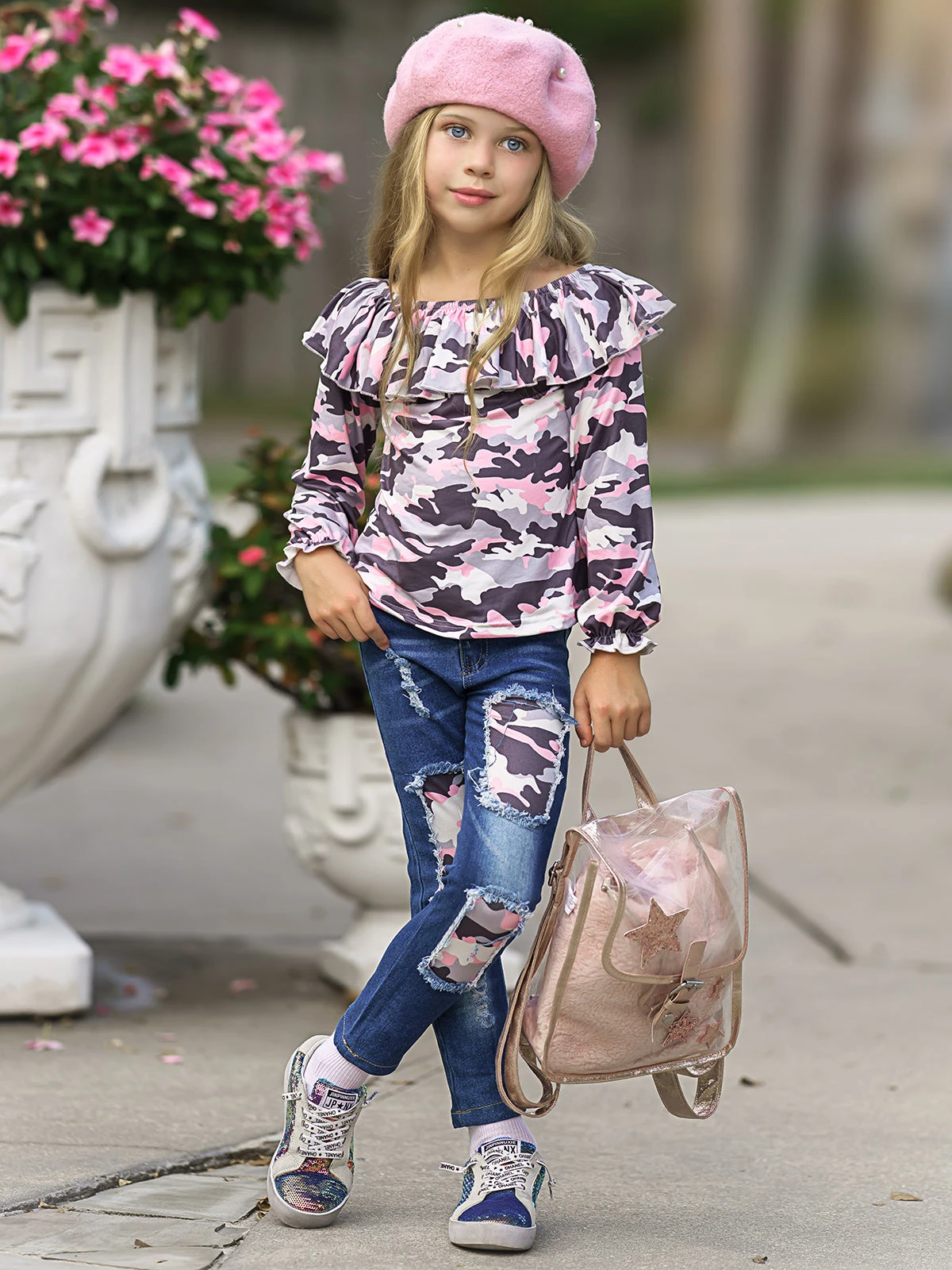 - Don’t act like you can’t see all the camo cuteness of our girls’ patched jeans set. Adorable pre-styled so all she has to think about is how amazing she looks as she heads out the door!