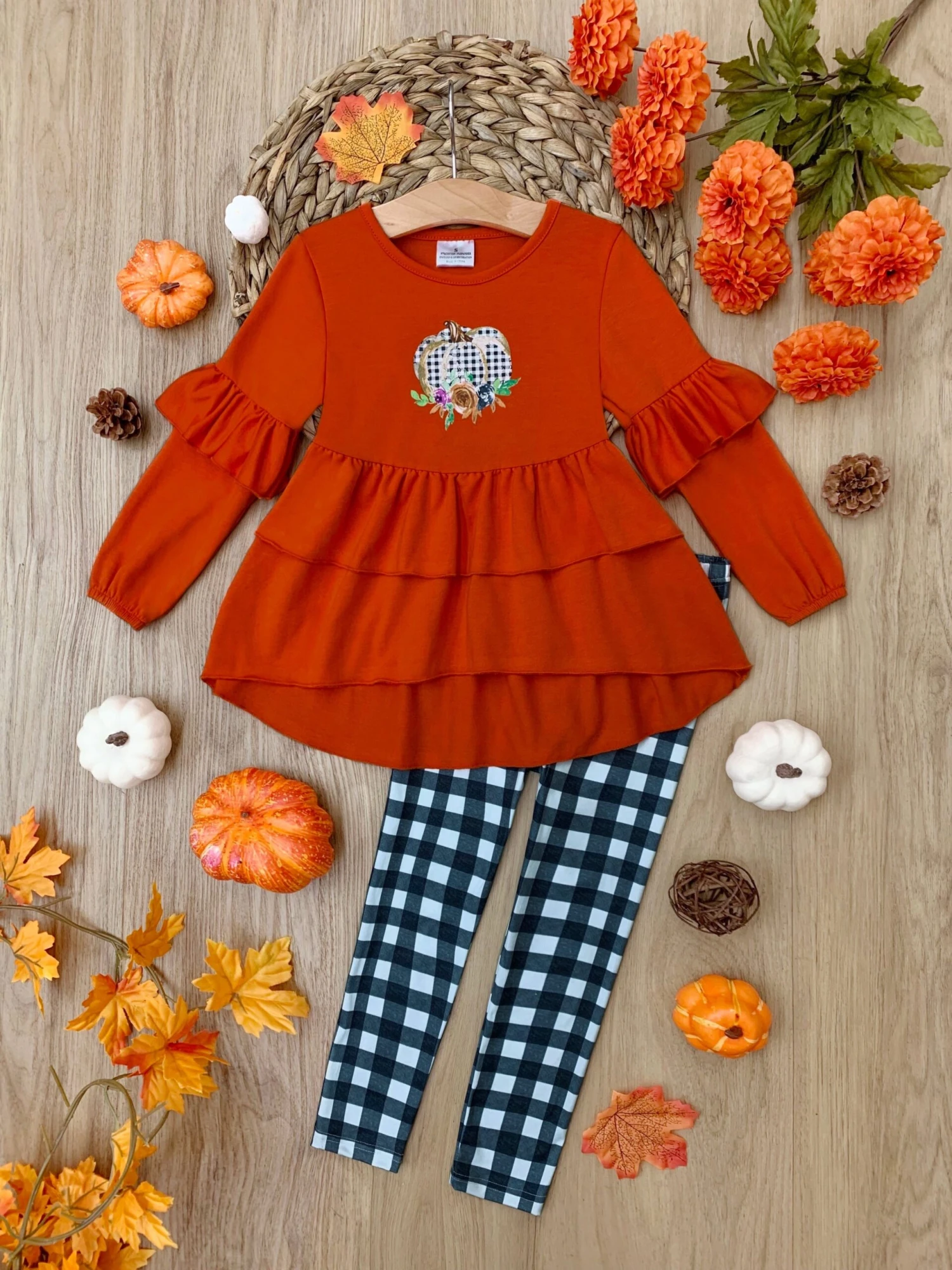 - Long-sleeve hi-lo tunic with plaid pumpkin graphic, ruffle sleeve accents, tiered ruffle hem, and matching plaid leggings