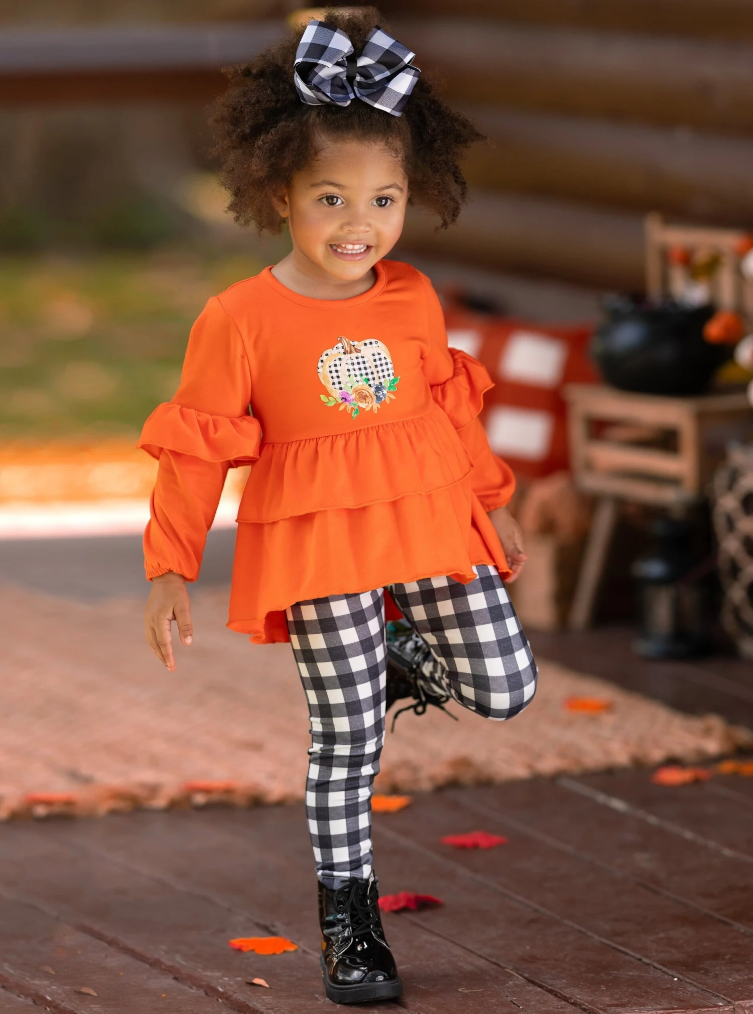 - Give them PUMPKIN to talk about in this preppy-chic girls’ plaid legging set. The vibrant orange pops with the checkered design for a fashion-worthy finish your fashionista can wear with her friends.