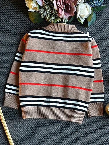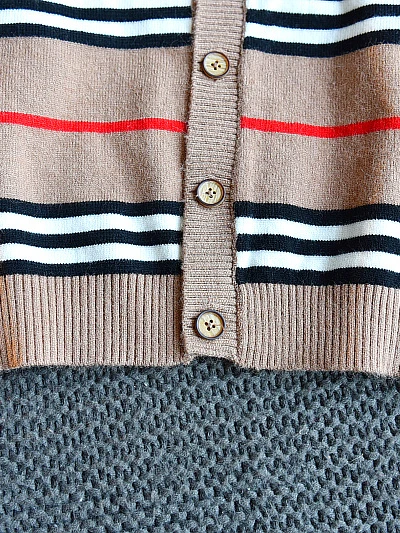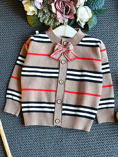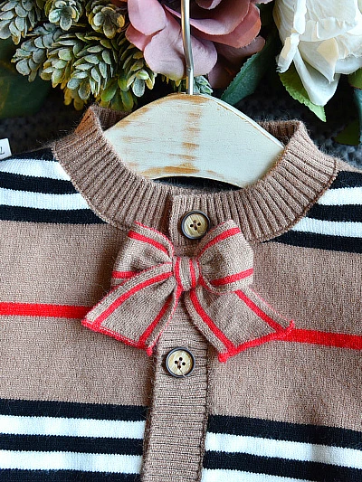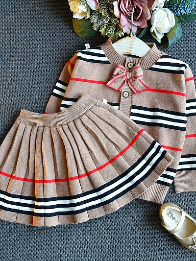 - Button-down striped cardigan with bow accent and matching pleated skirt