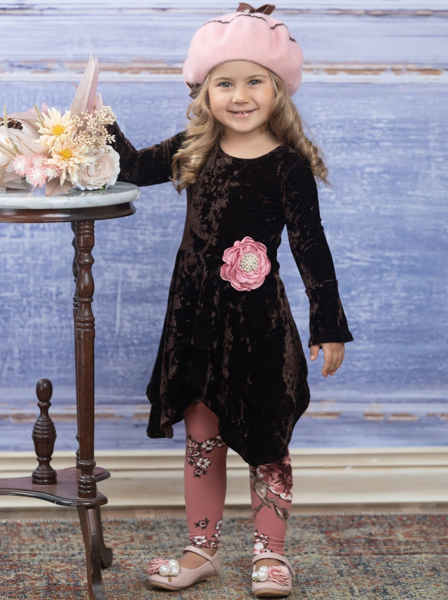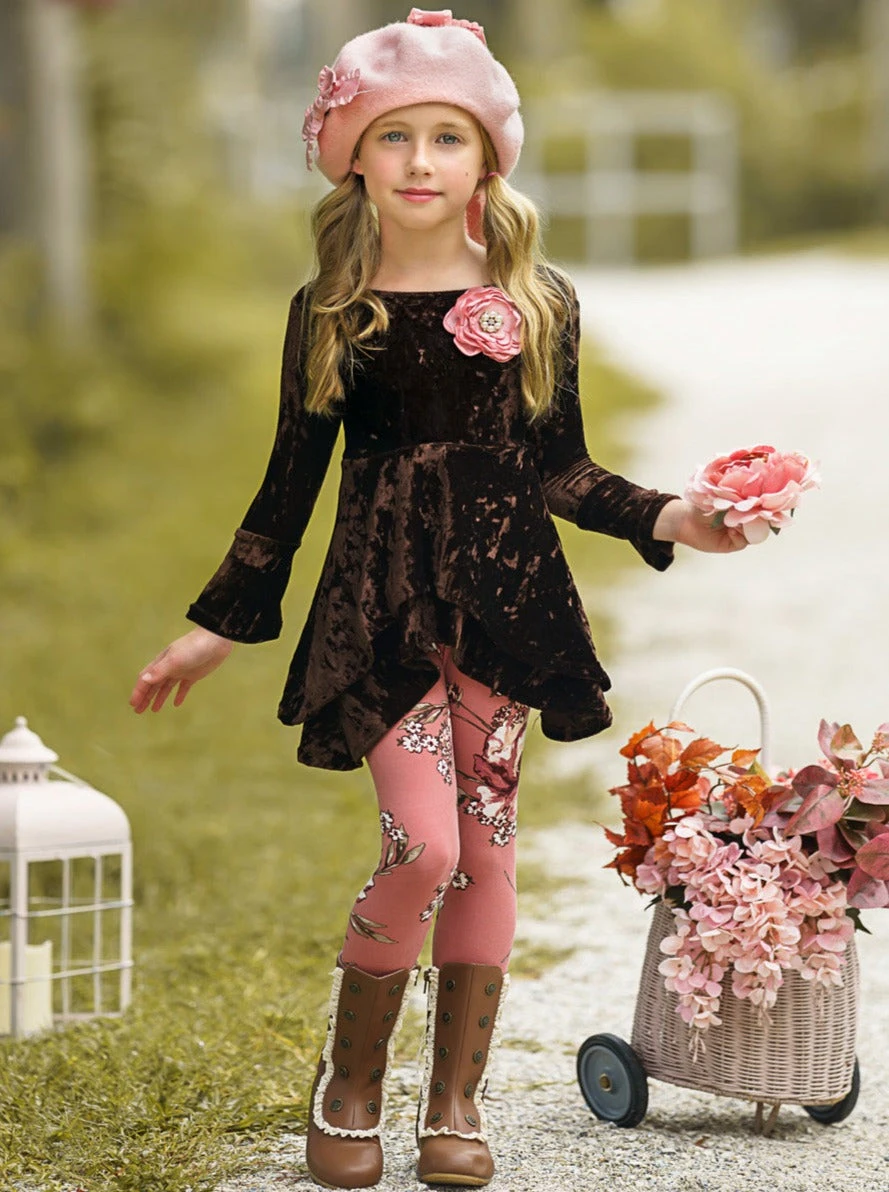 - Give your little girls this cute crushed velvet sidetail tunic and floral legging set to feel like a true fashionista. Watch her show it off to family and friends with confidence.