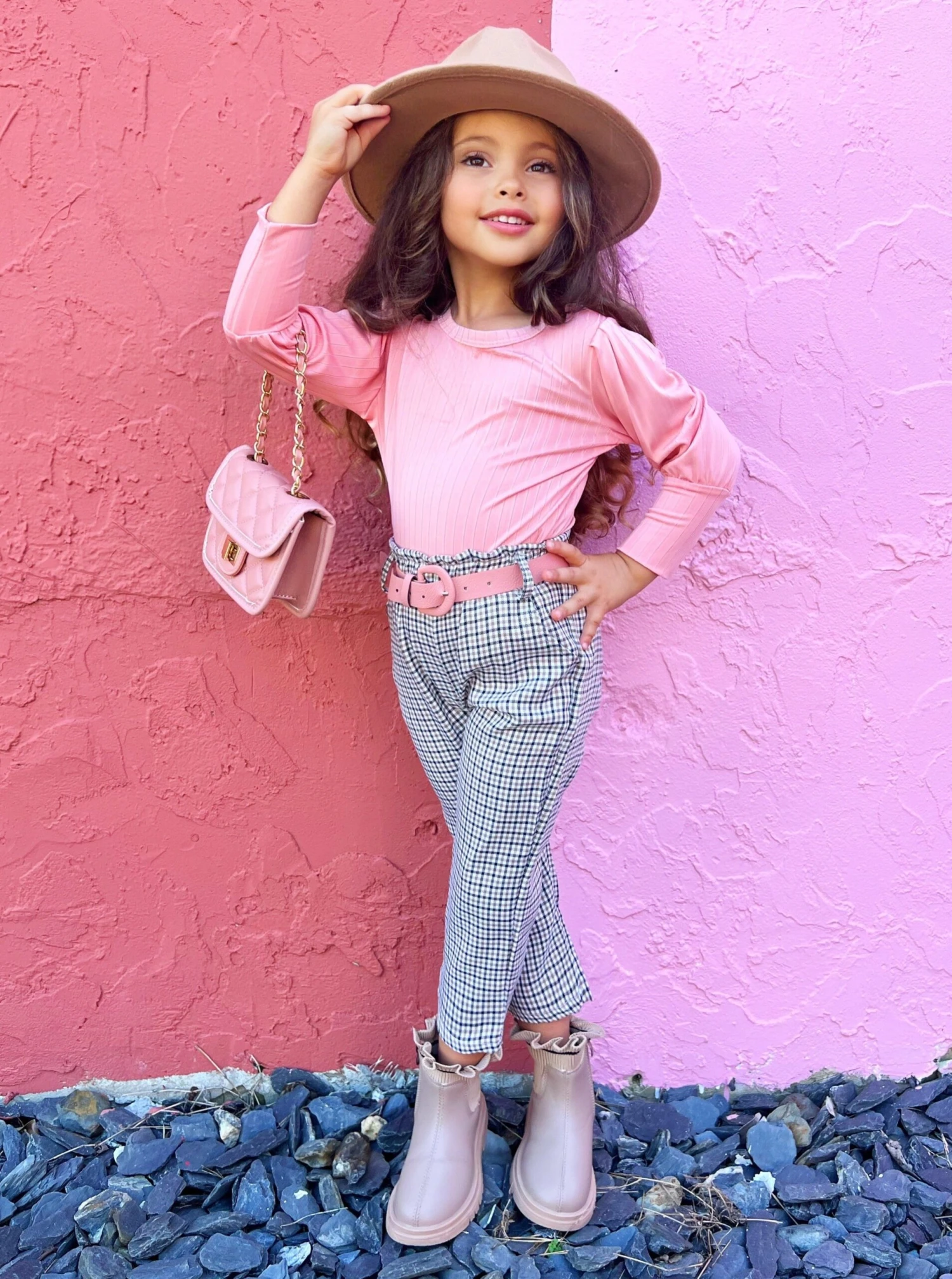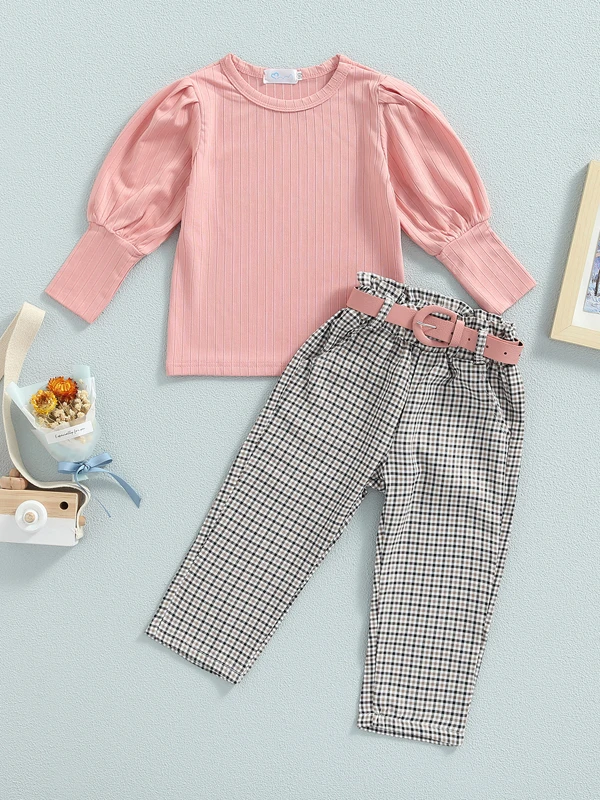- Long-sleeve puff sleeve top with garterized high-waist plaid pants; comes with a stylish belt to add accent and cinch the waist