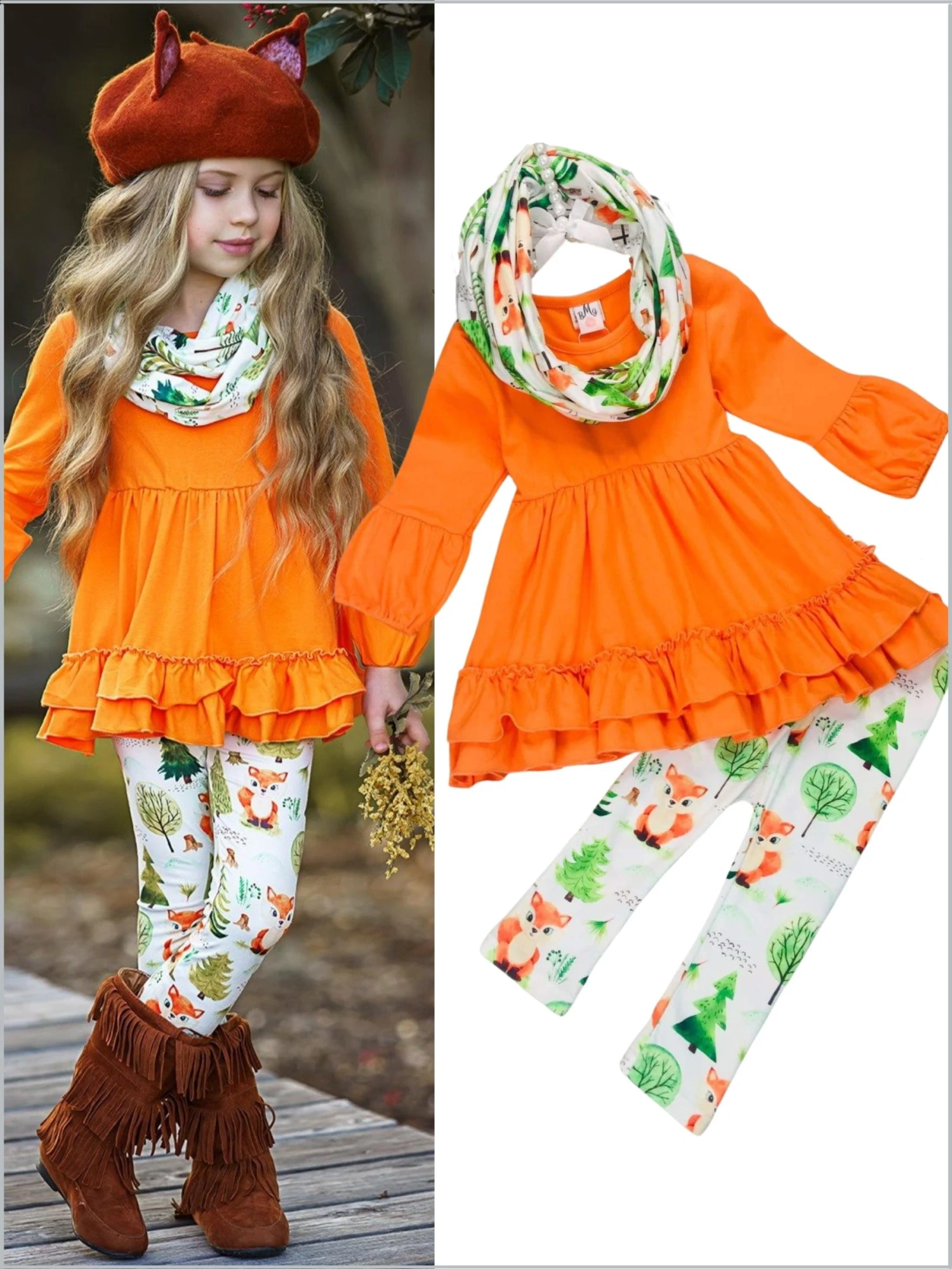 - Long-sleeve tunic with puffed cuffs, tiered ruffle trim, fall foliage print leggings, and matching infinity wrap scarf