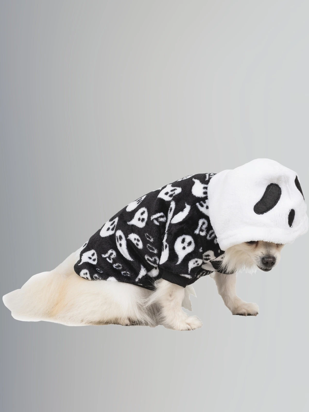 - Long-sleeve ghost print hoodie onesie with front pull-up zipper, cuffs, and front zipper pockets