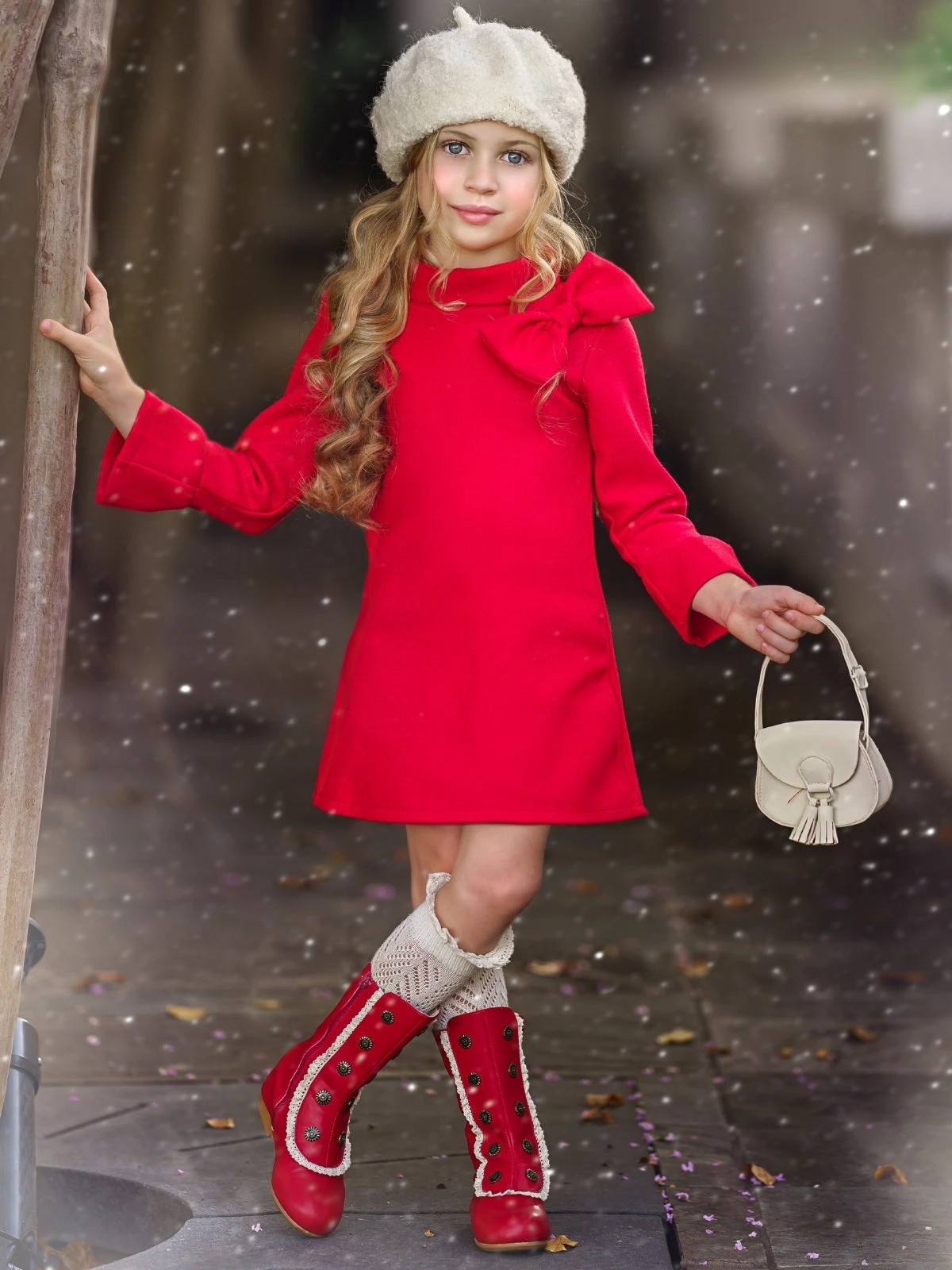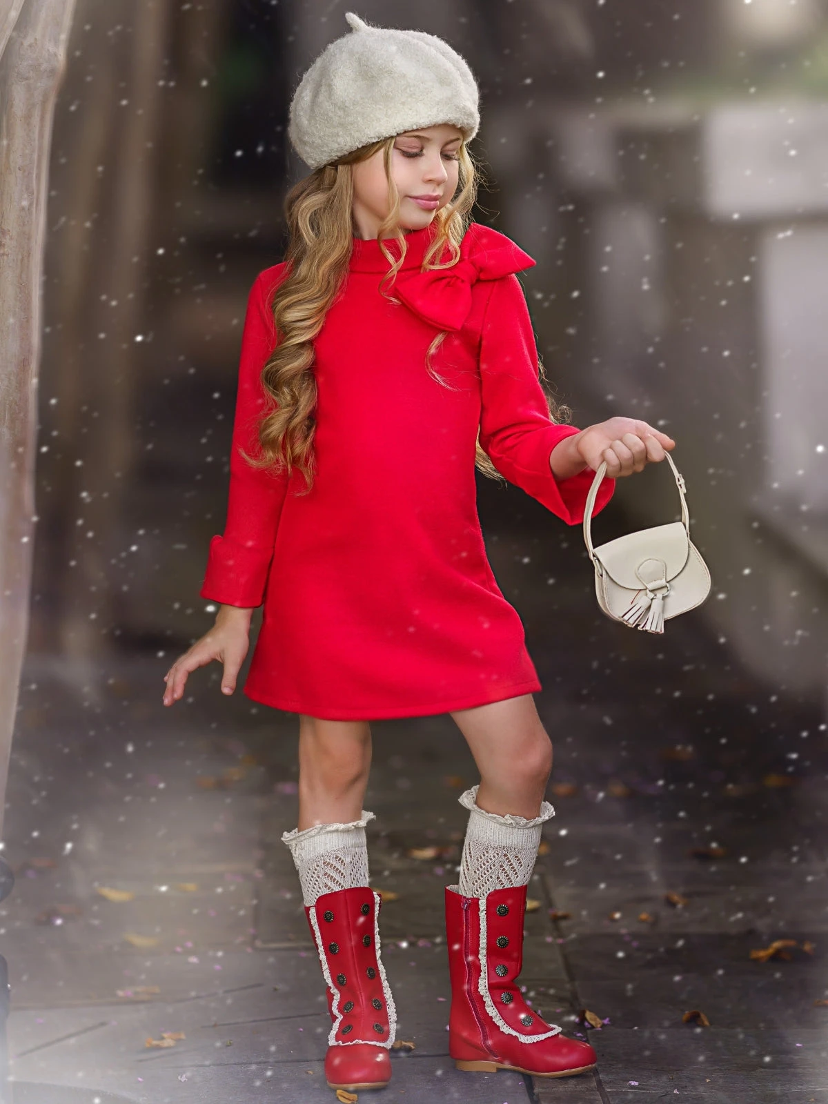 - Long-sleeve A-line dress with a wide turtle neck, large bow detail, and ruffled scuffs