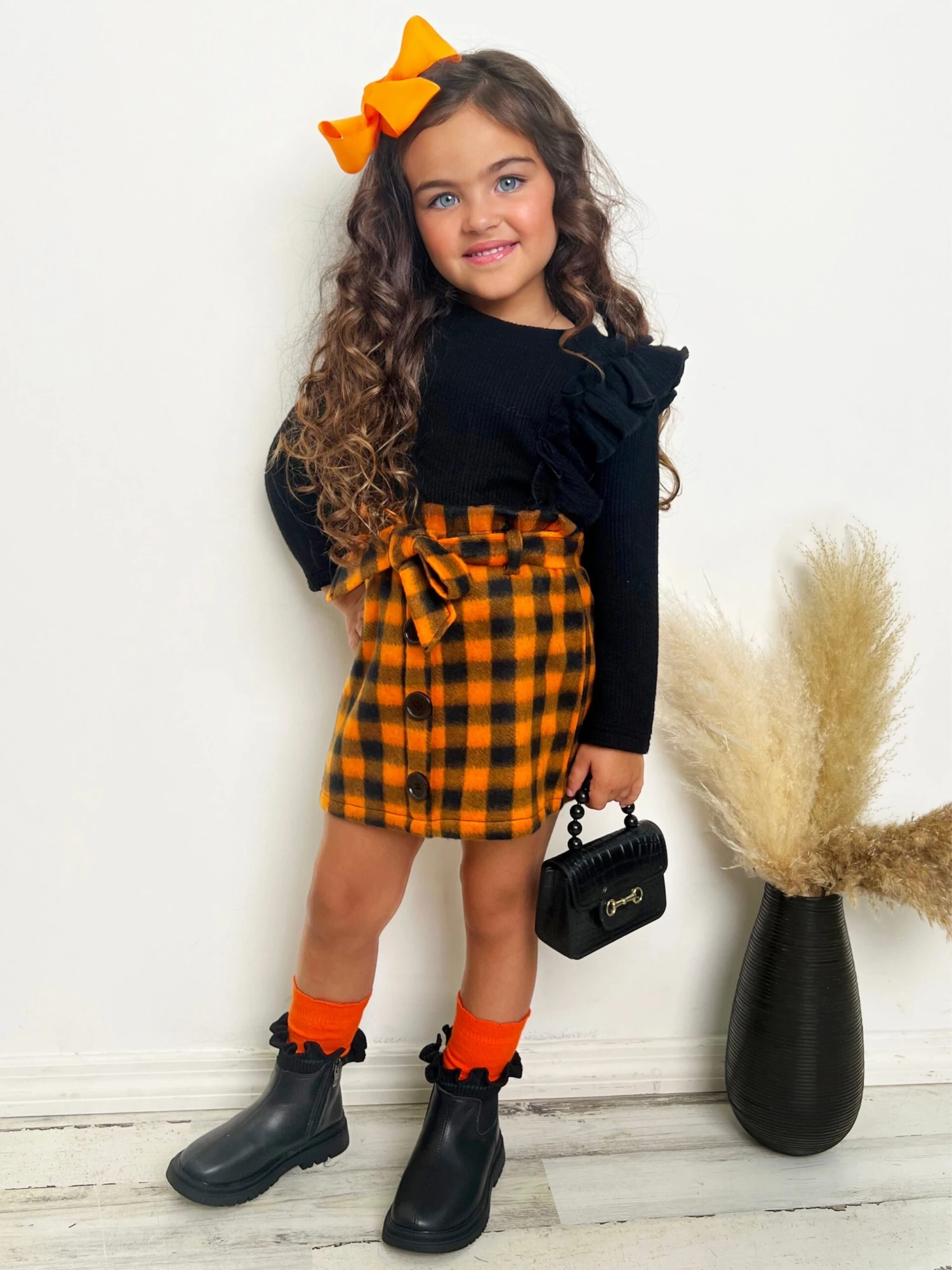 - Make way for your little fashionista! This black ruffled sweater and orange checkered skirt set sports the season’s best style, from its chic detailing to its fall colors. Your baby will be the coolest IT girl on the block!