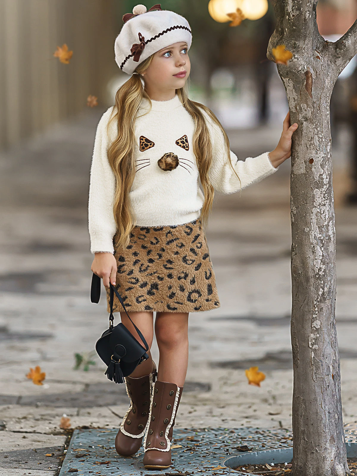 - Kitty face applique pullover sweater and a matching leopard print wool skirtÂ
