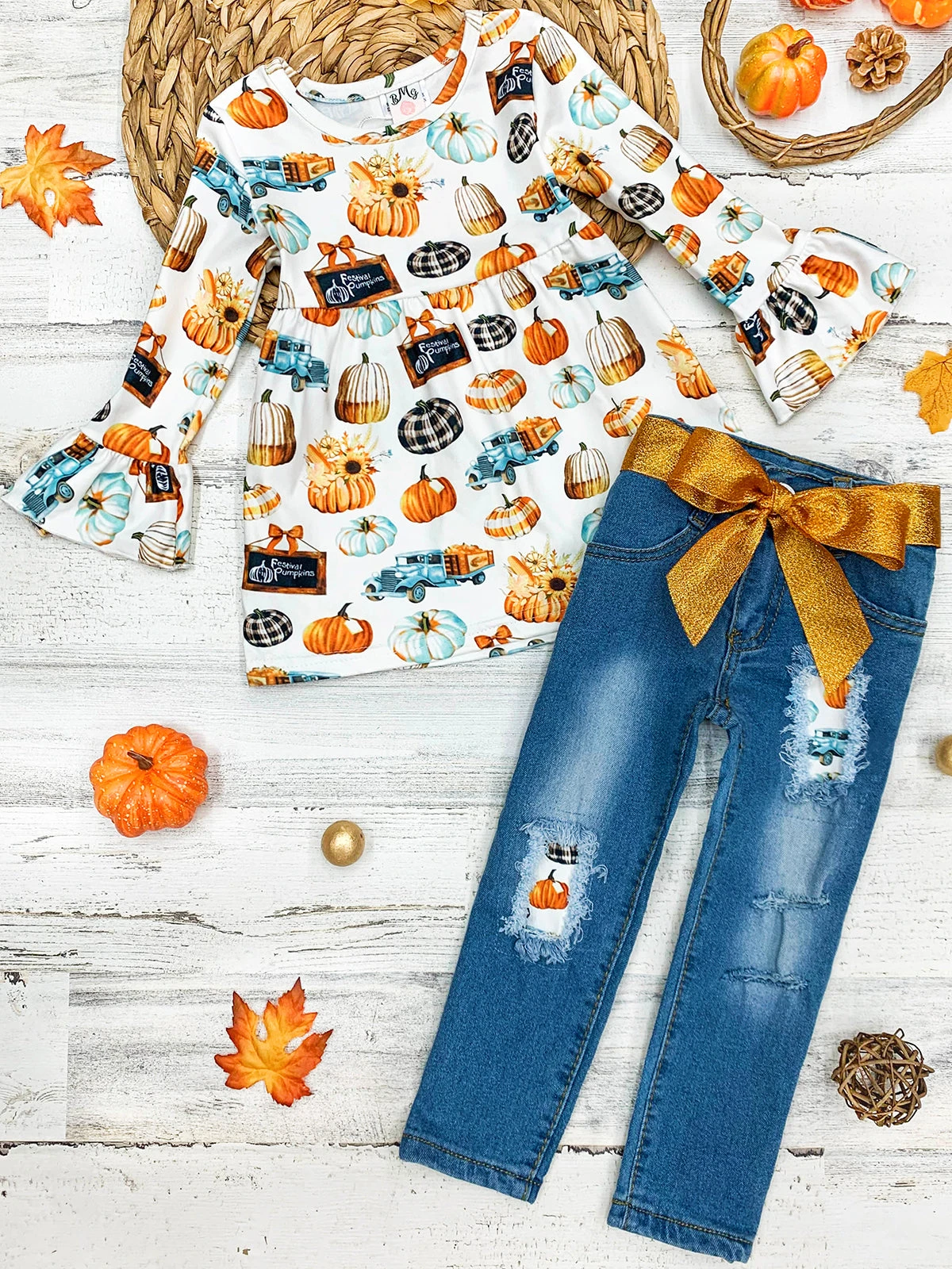 - Get your harvesttime honey in the festive spirit and looking sweeter than pumpkin pie in this precious jean set! Is that a glitter sash? Your little girl will love it