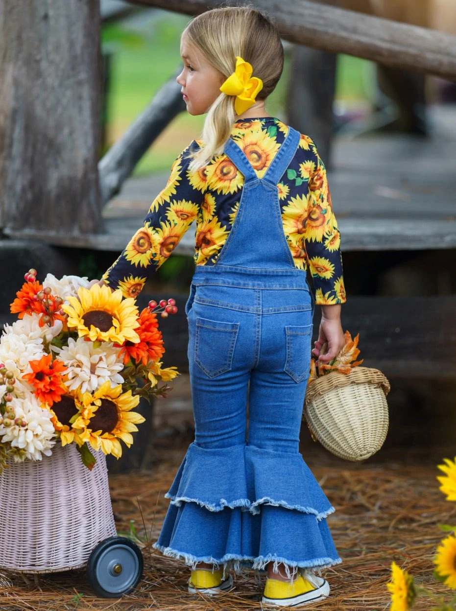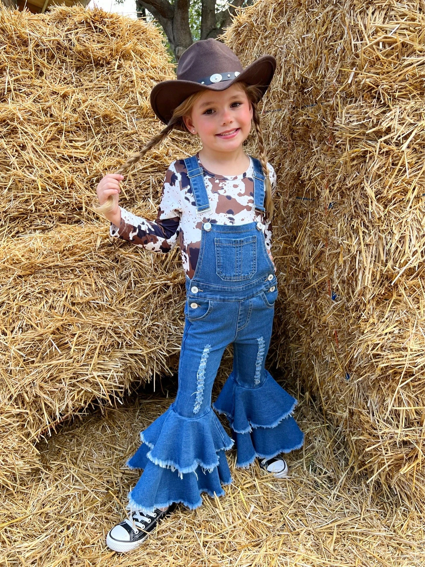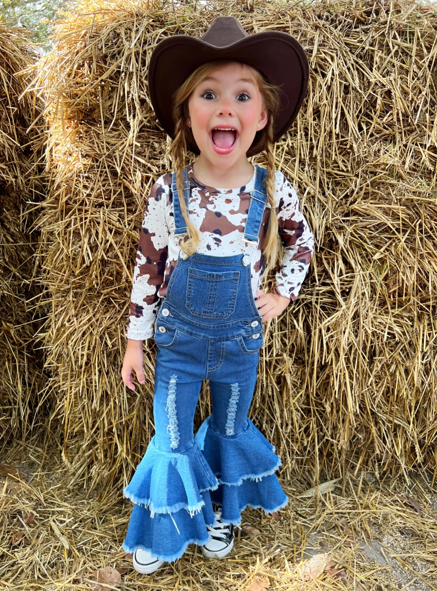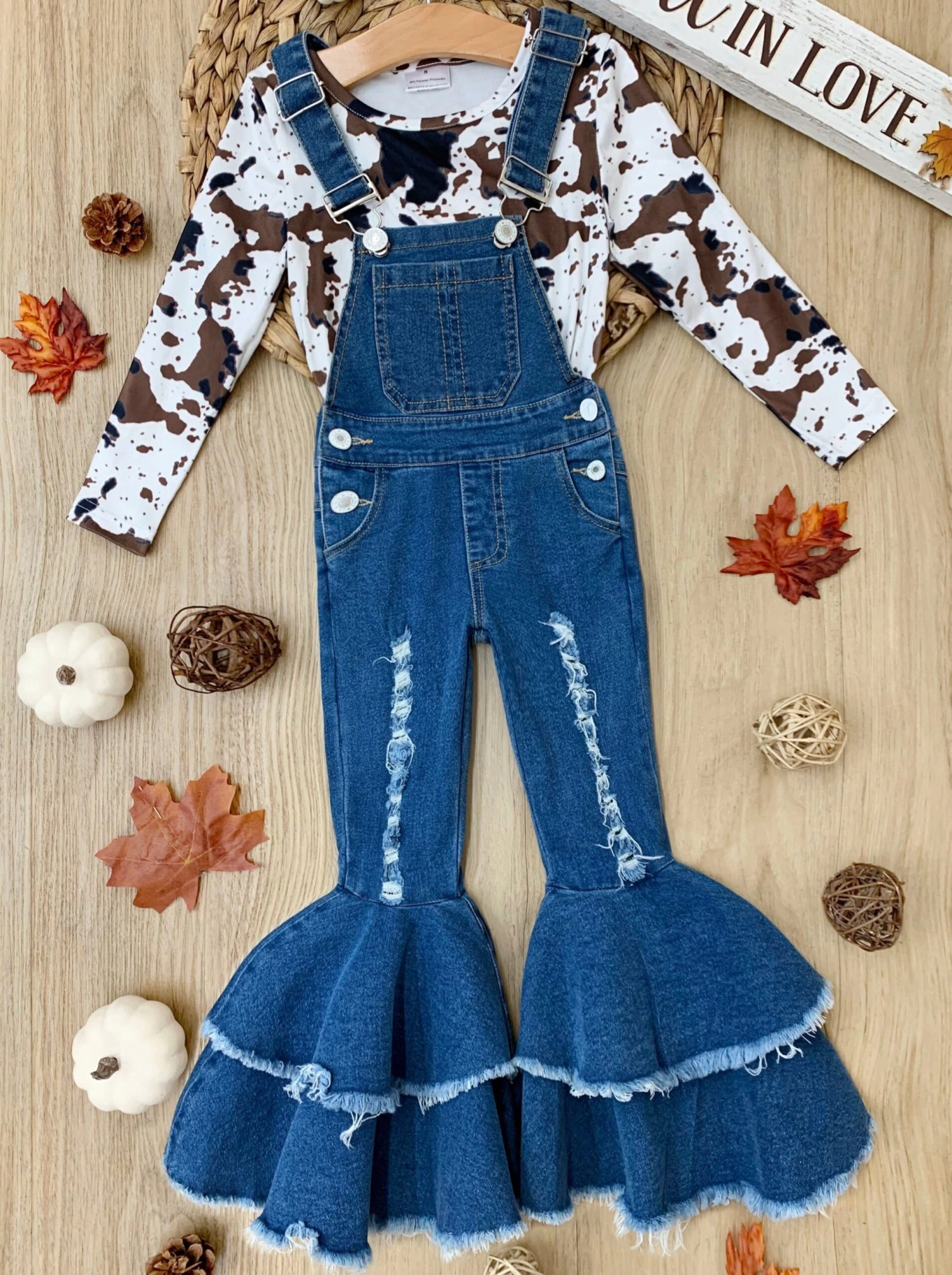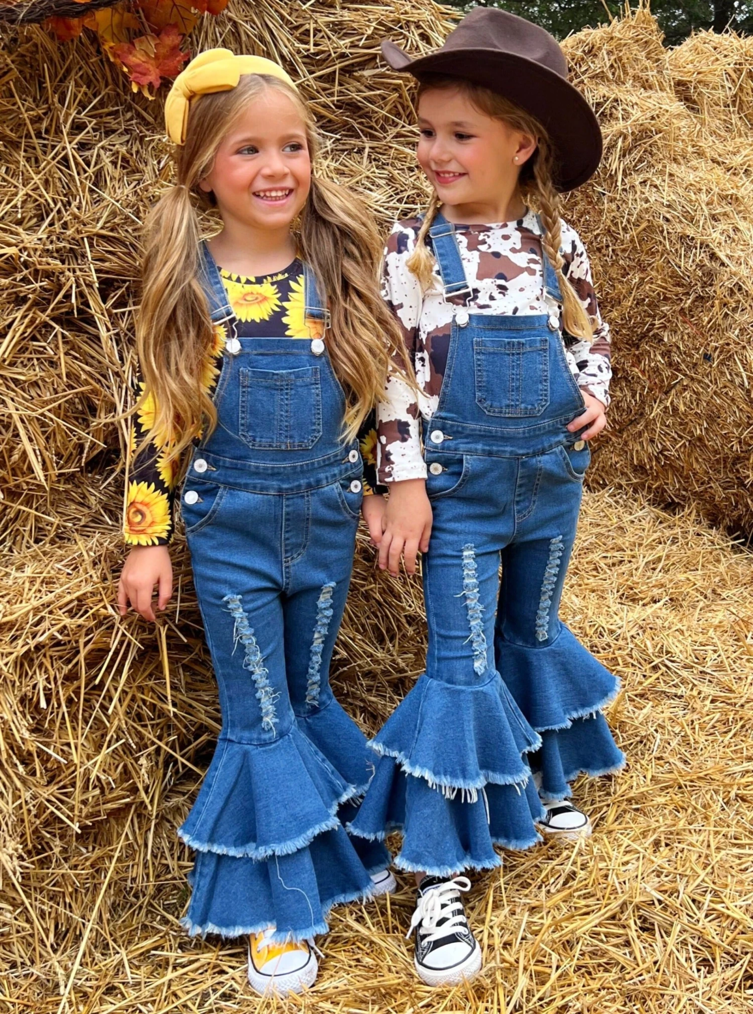 - Your denim diva will adore twinning with her bestie in our stylish denim overall set! The overalls are simply irresistible with adjustable straps, trendy distressing, and layered bell bottoms. Your fashionista can choose between brilliant sunflowers or a sassy cow print for her long-sleeve top!Â