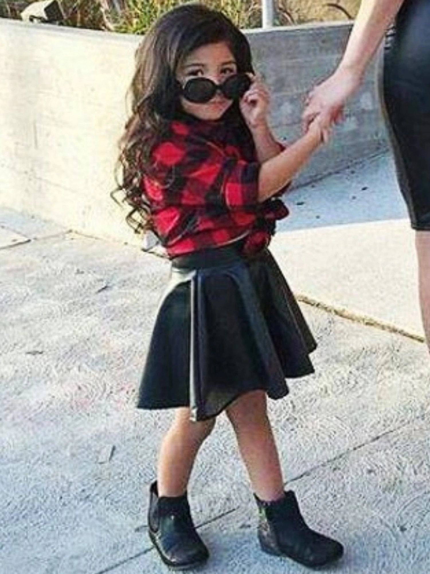 - Includes: One plaid top and one faux leather skirt
