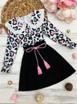 - The set features a long-sleeved top with tulle polka dot sleeves and an A-line skirt with a sash