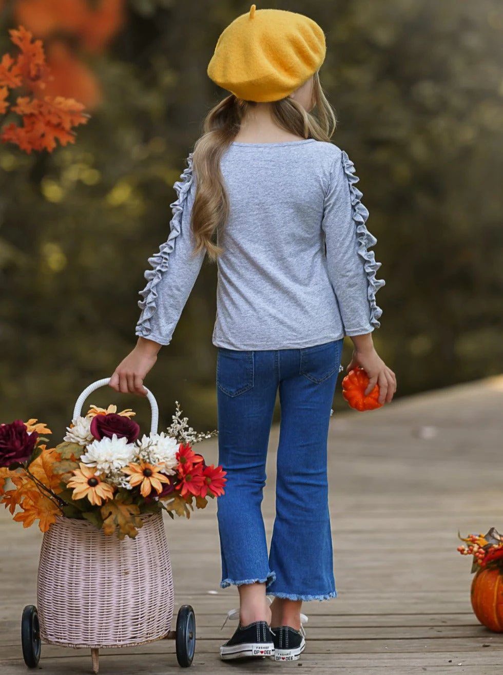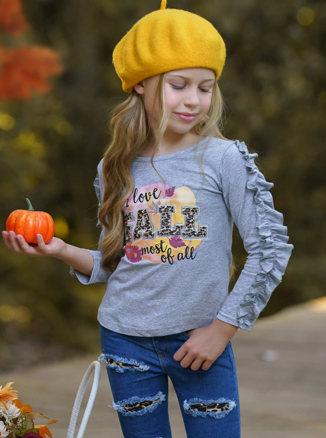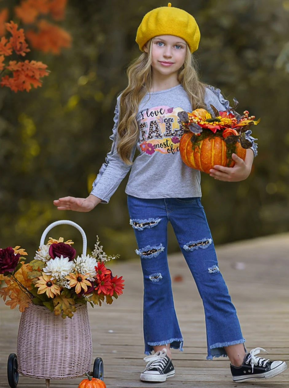 - Long-sleeve “I love Fall most of all” leopard print graphic top with cascading ruffle sleeve trim and leopard print patched jeans with frayed hi-lo hem