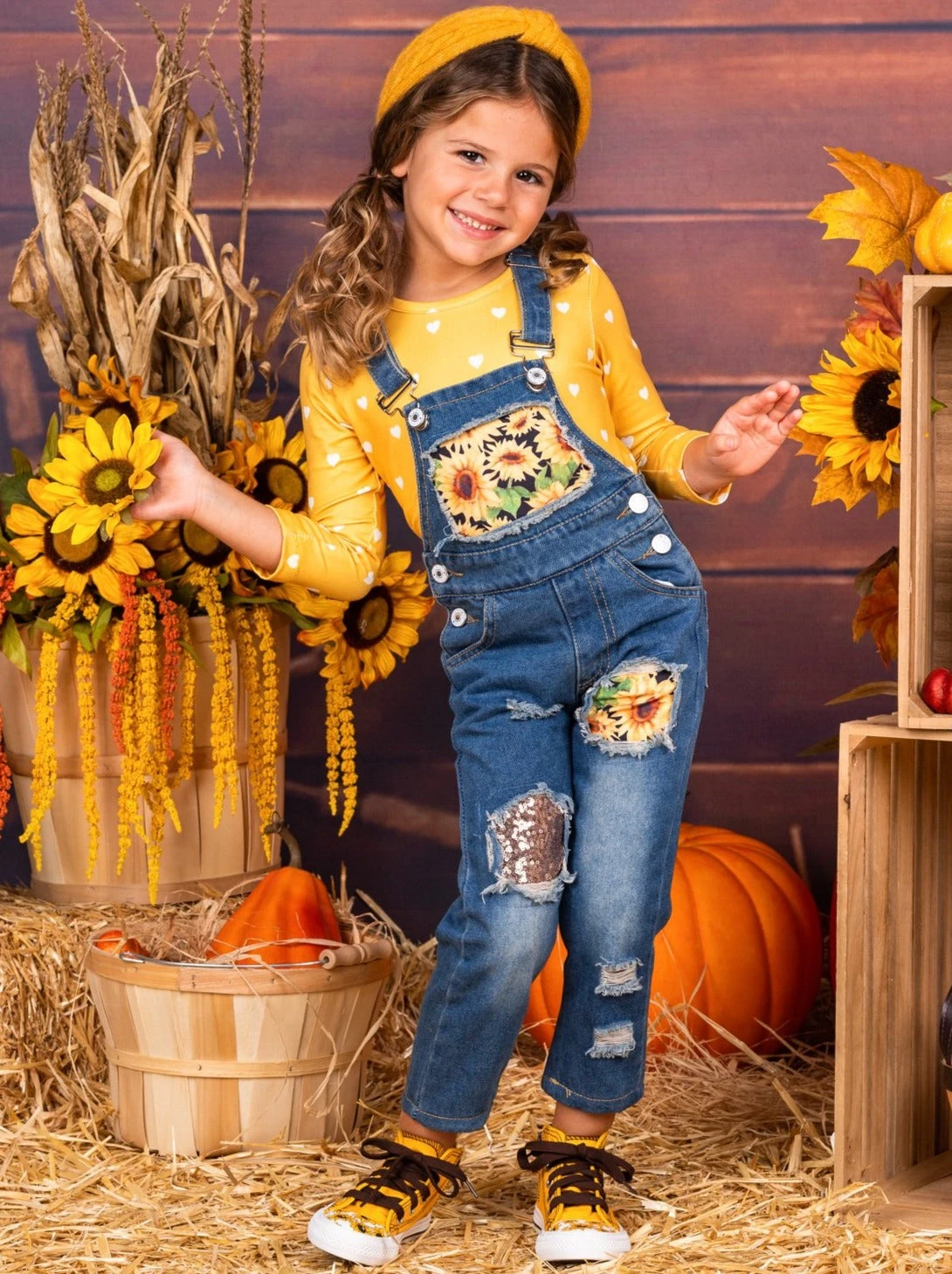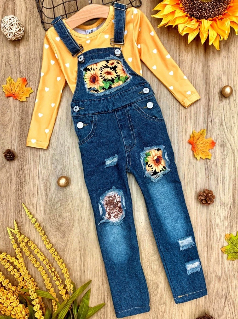 - Hey, sunflower! Get out and bloom in this charming patched overall jean set. Bright colors and adorable patterns with a dash of sparkly sequins to top it all off. SO CUTE!