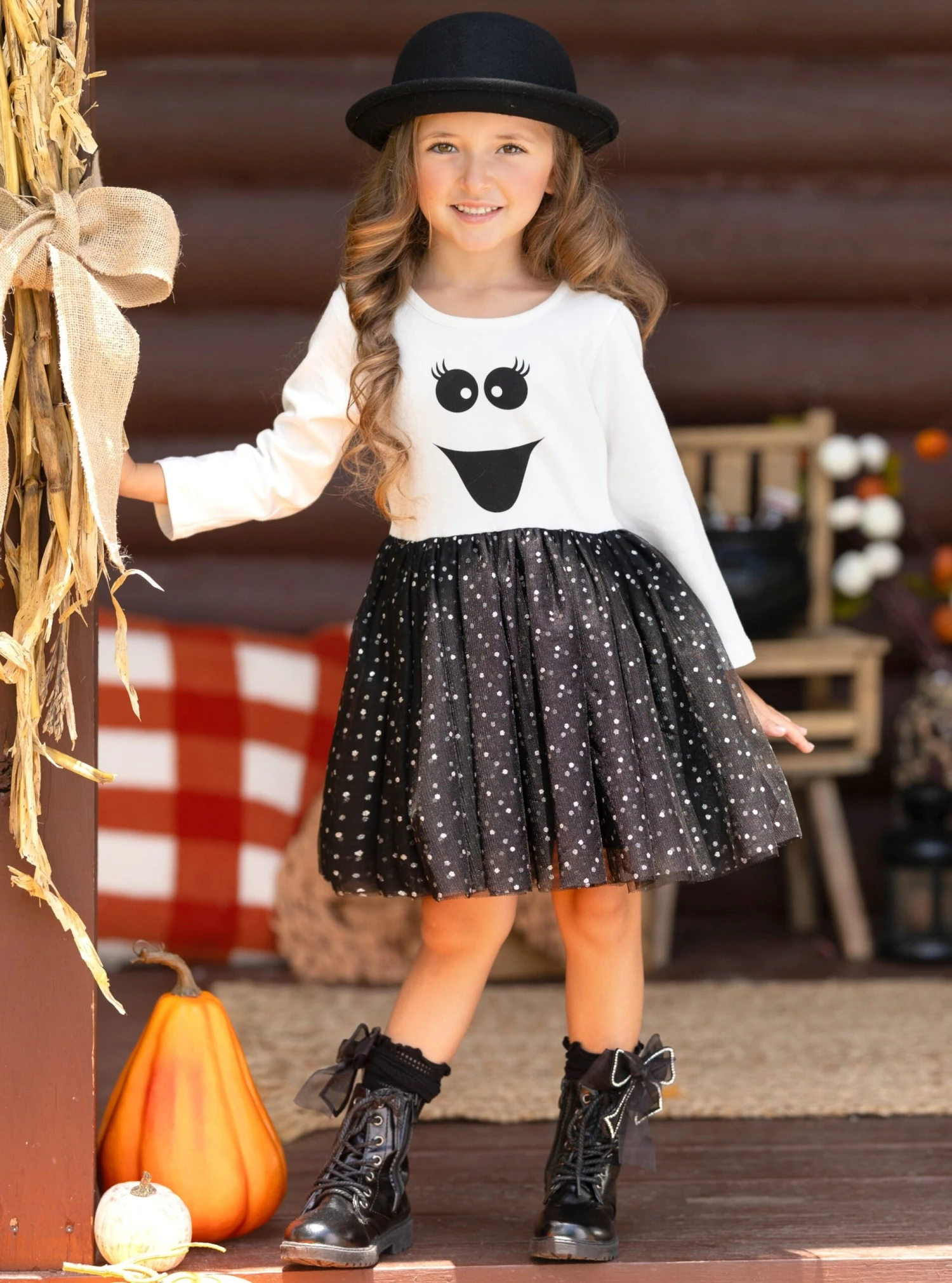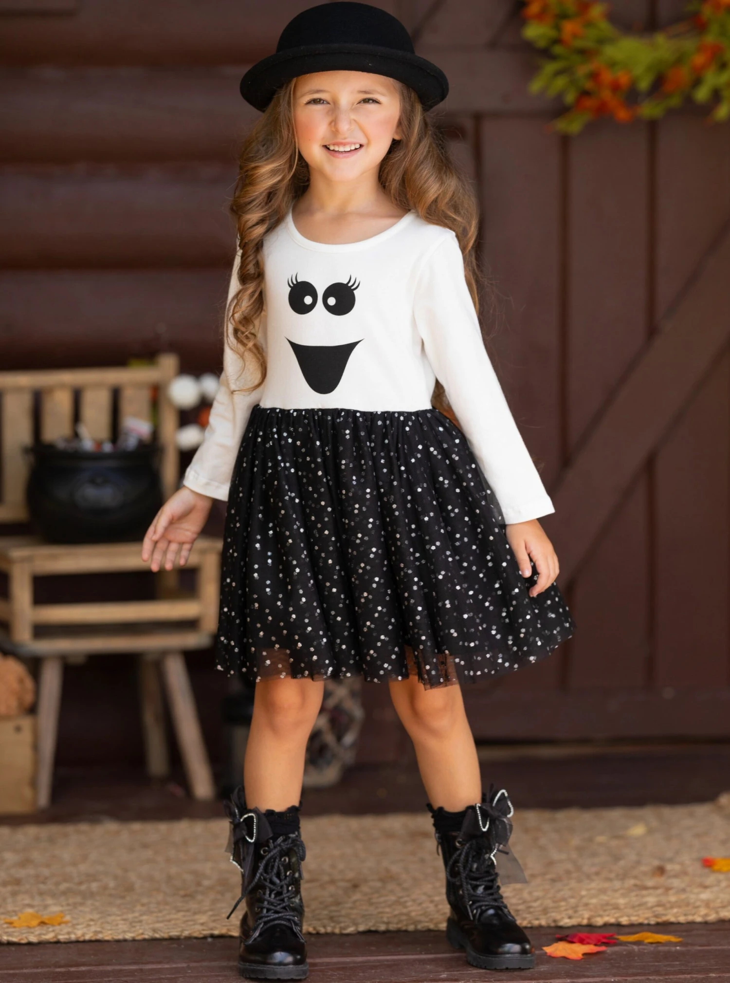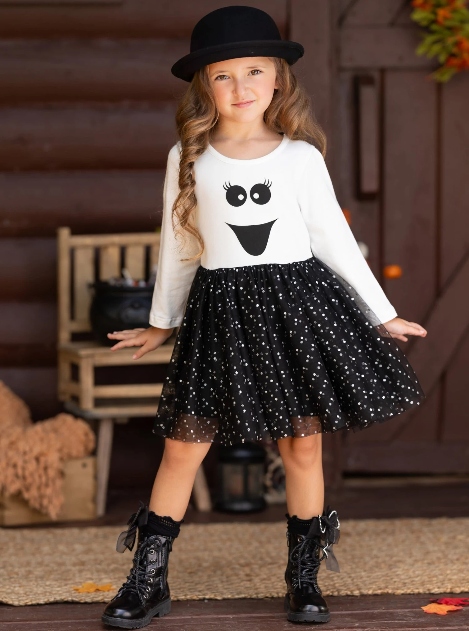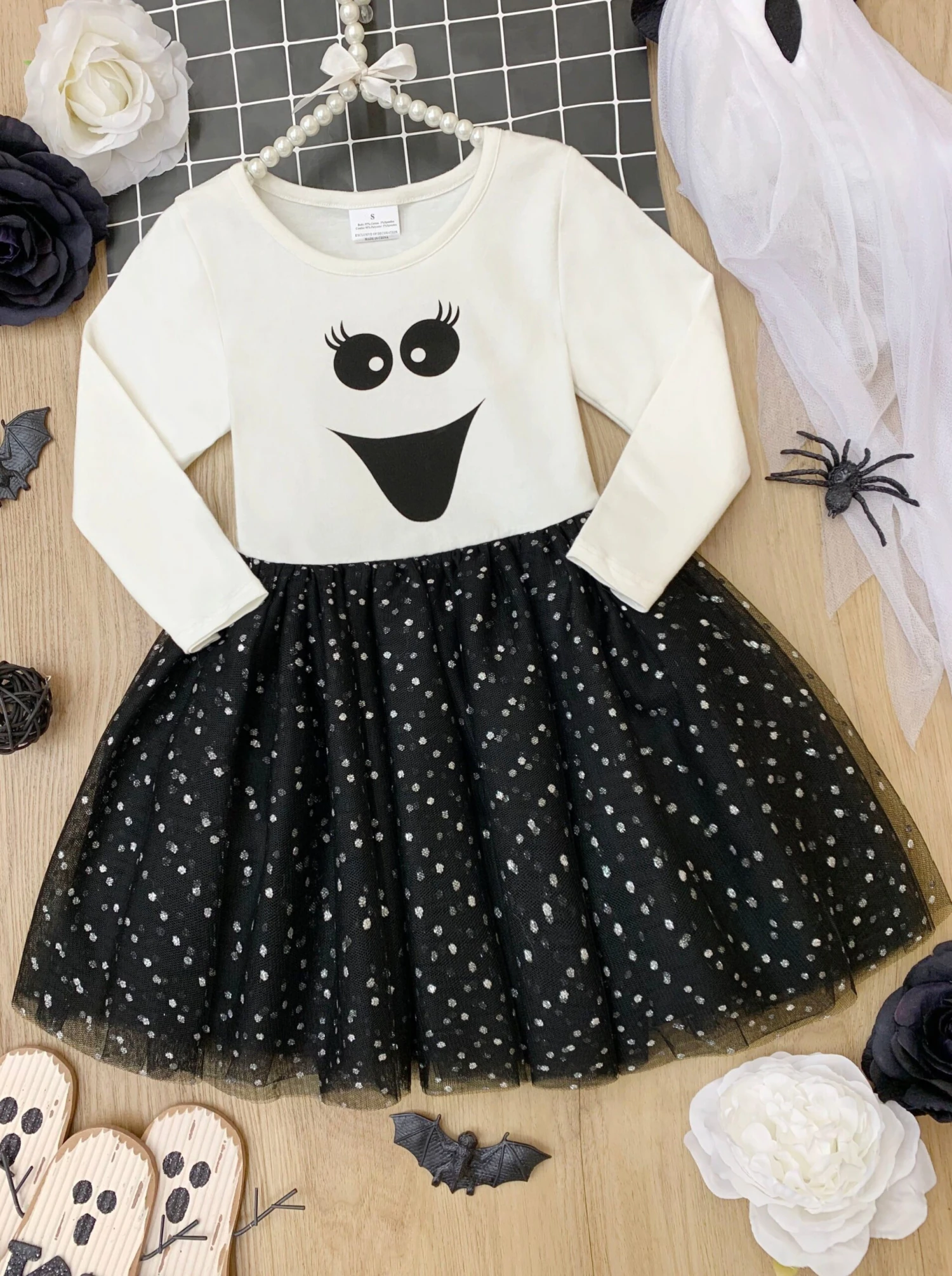 - Long-sleeve tutu dress with happy ghost face graphic bodice and a sparkly glitter gathered tulle skirt