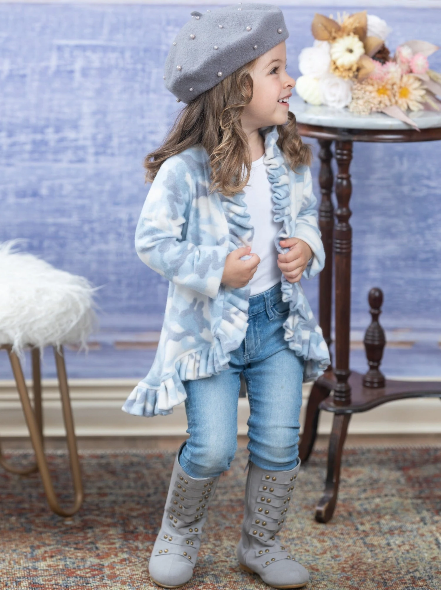 - When your little girl feels the fabric of our cute ruffle cardigan, she’ll never want to take it off. Trendy faded camo andĀ chic ruffleĀ design for relaxing or out playing with friends.