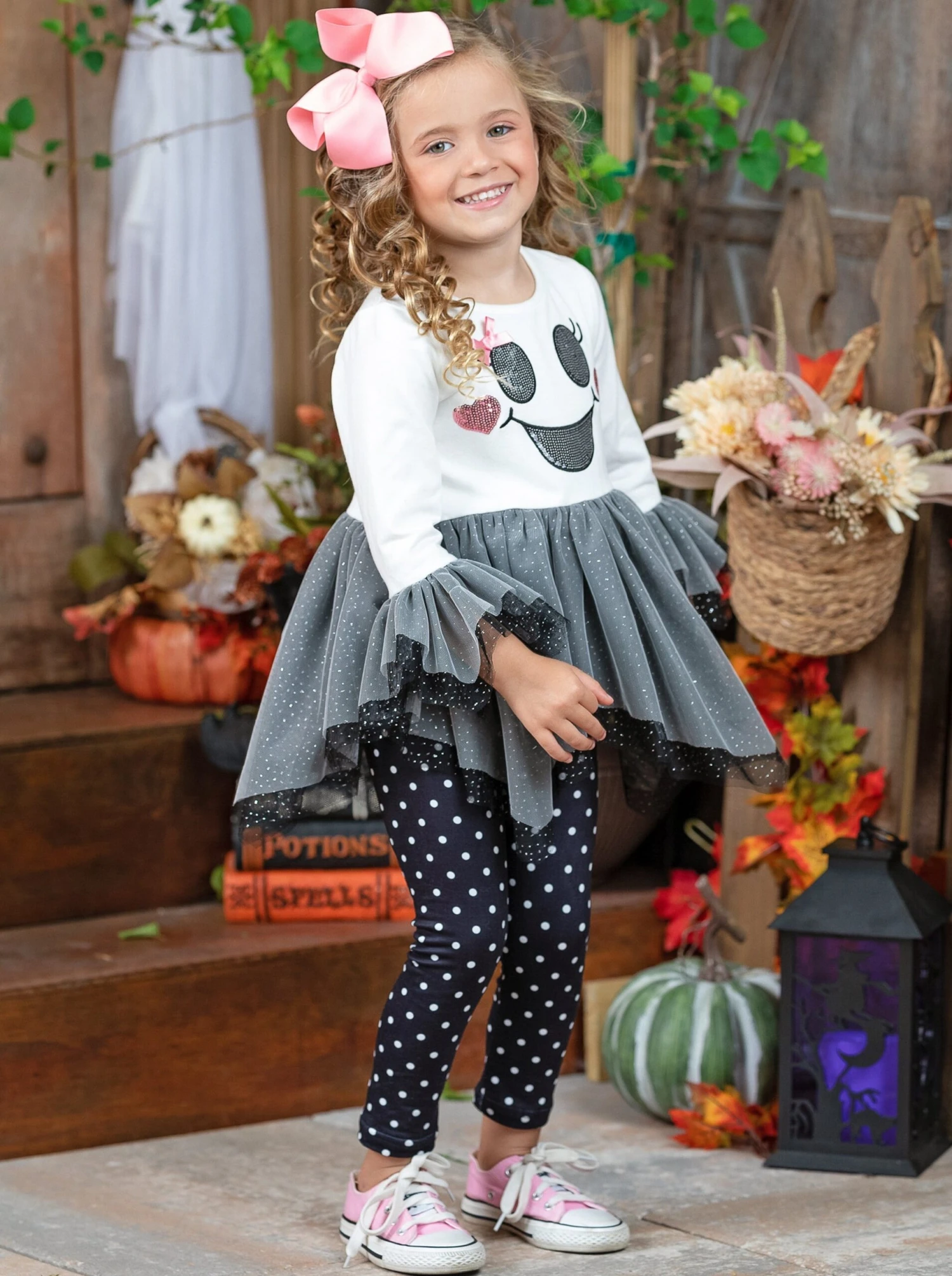 - Long-sleeve tutu tunic with glitter ghost applique bodice, tulle layered skirt and cuffs, and polka dot leggings