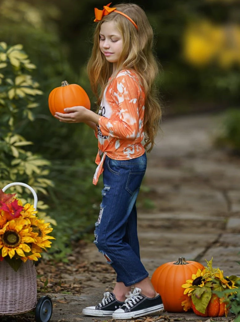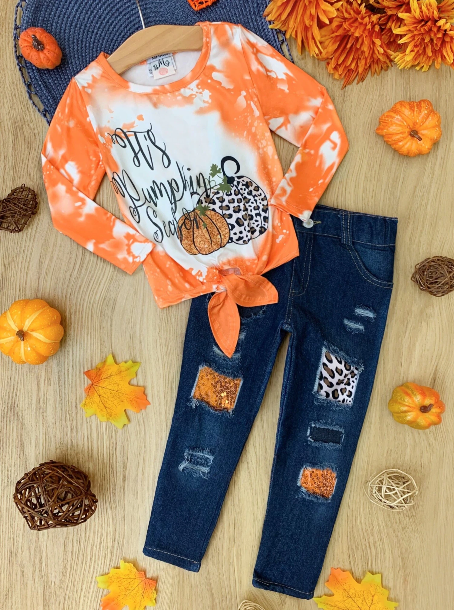 - Make the pumpkin season oh-so-special for your princess with this festive set to rack up praise and compliments. A knot-hem tie-dye top and jeans with matching sequin patches will keep her on-trend and looking sweeter than pumpkin pie!