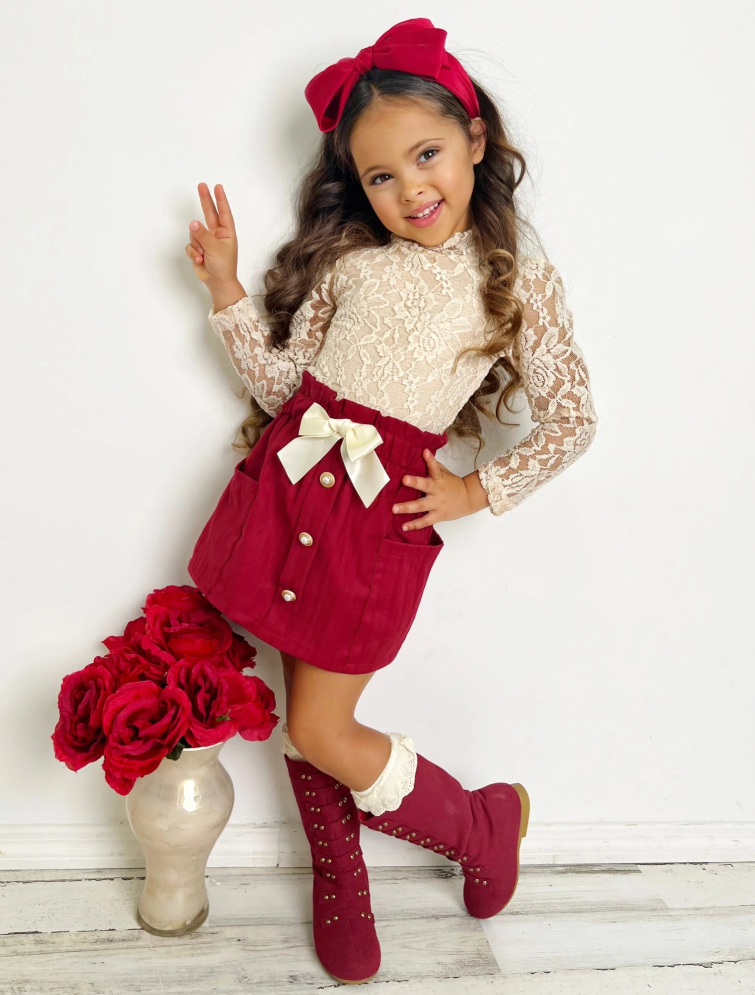 - Your little girl will be ‘laced to impress’ in our lace top and red skirt set! This stylish pairing boasts feminine flair with its sophisticated details and cute bow accent. Perfect for darling fashionistas!