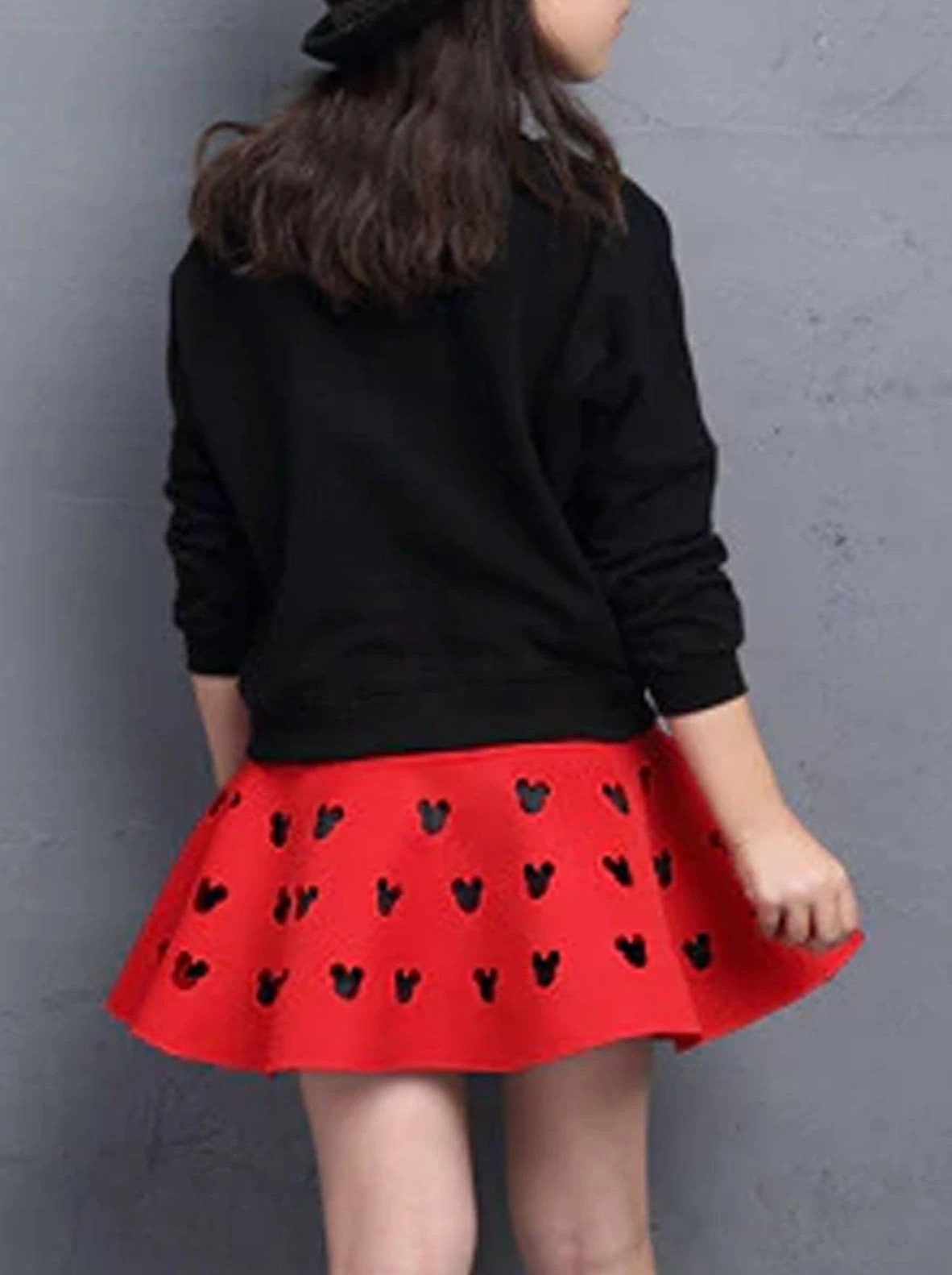 - Minnie Mouse-inspired applique pullover sweater with a cut-out heart print pleated skirt