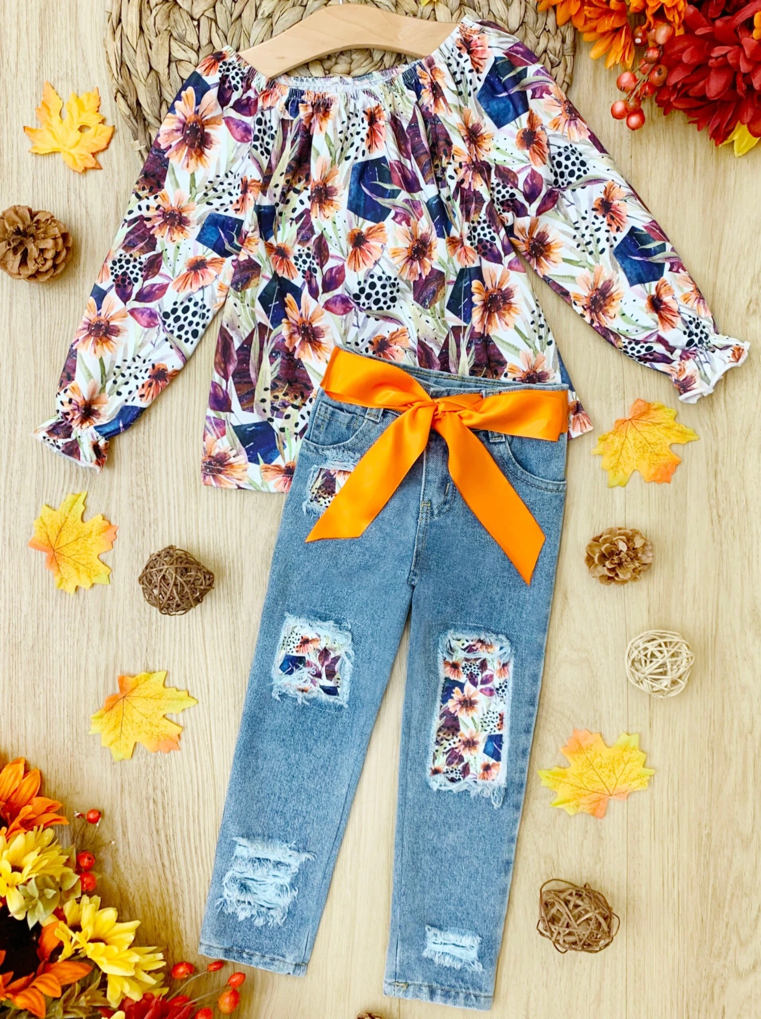- When you’re too blessed to be stressed, it shows in this charming floral ruffle cuff blouse with matching patched jeans. Your little love will be OBSESSED!