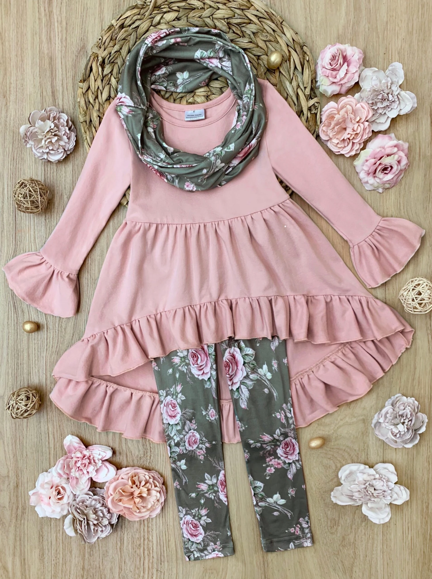 - Long-sleeve hi-lo tunic with ruffle cuffs and trim, sunflower print graphic pattern leggings, and matching infinity wrap scarf.Â