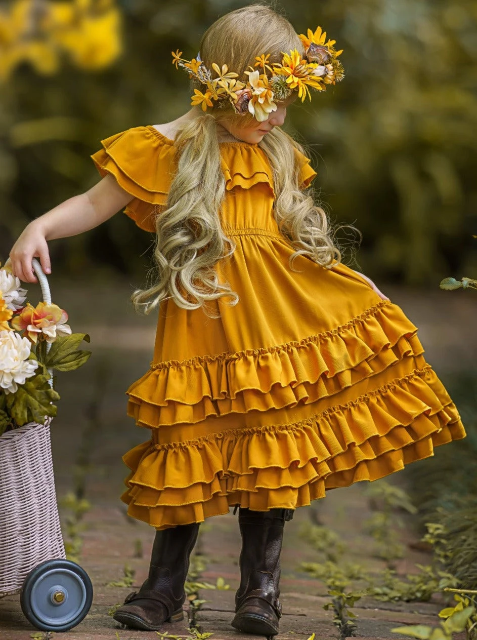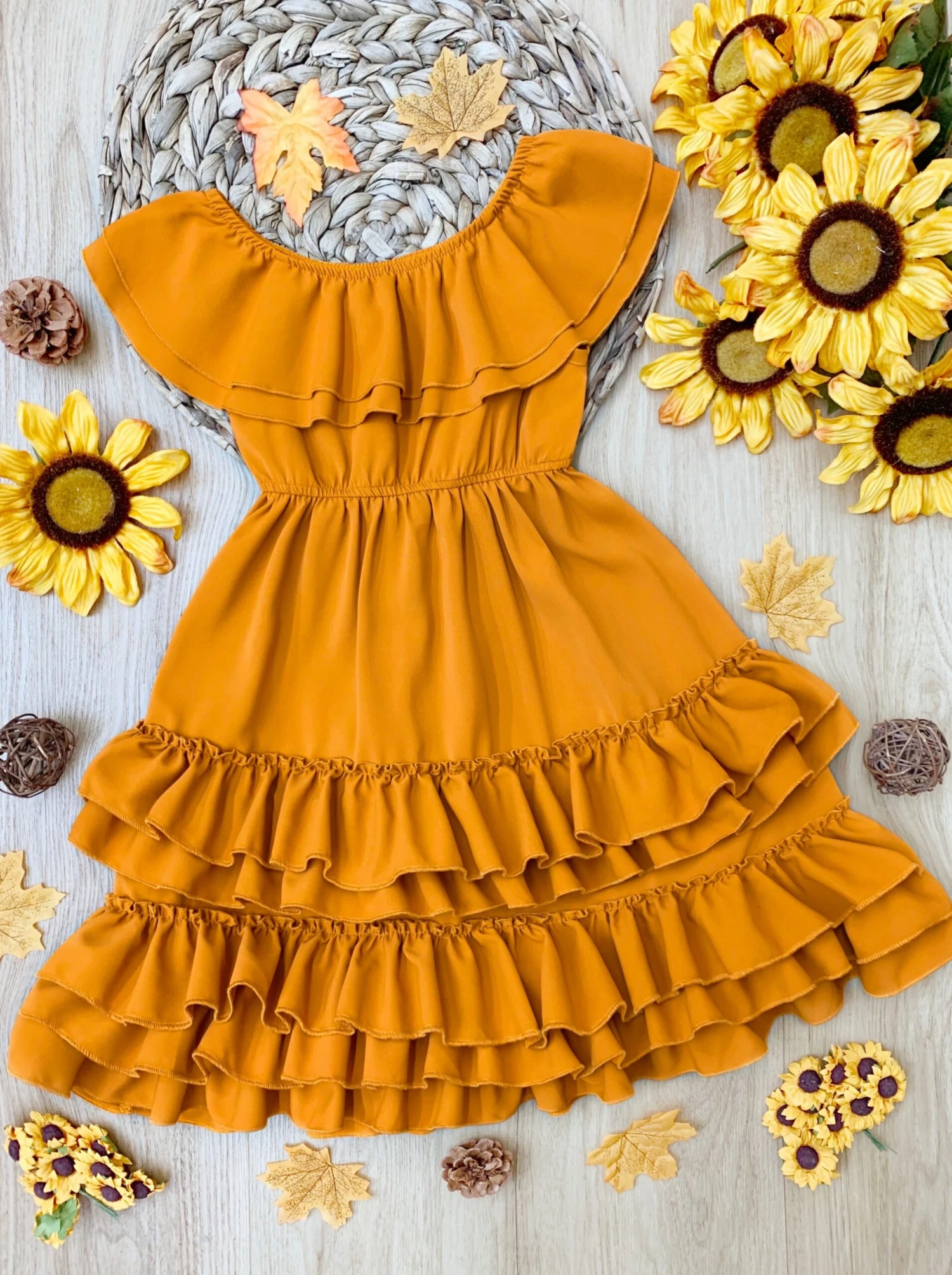 - We can’t get enough of the marigold color of this tiered ruffle midi dress. Your little girl will want to show off the twirl-approved skirt everywhere she goes!