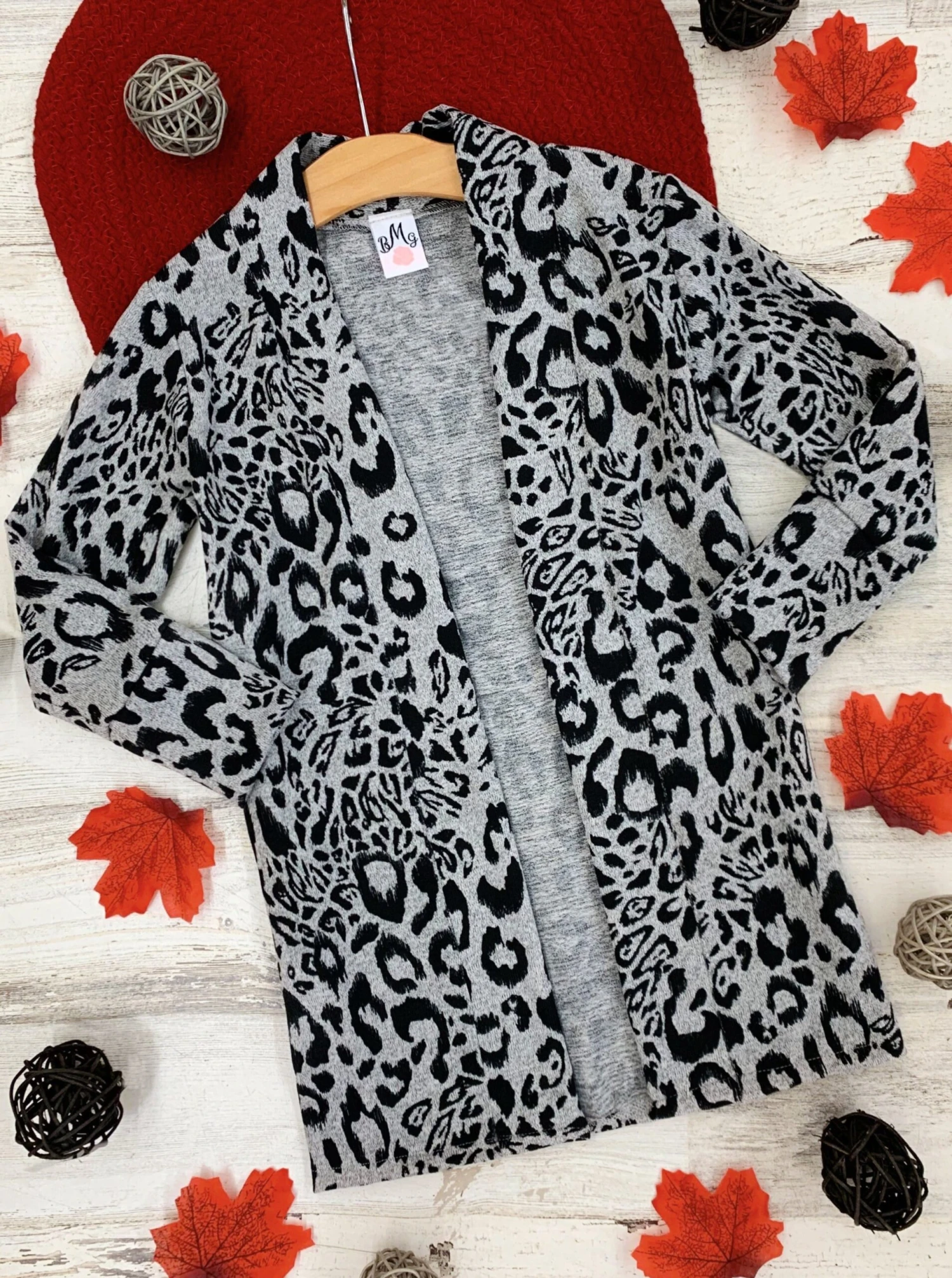 - Wild, fierce, and twinning like crazy, these oversized cardigans are the ideal mother-daughter matching outerwear. The soft grey background and snow leopard print pattern help tops, jeans, and accessories pop with vivid color.Â