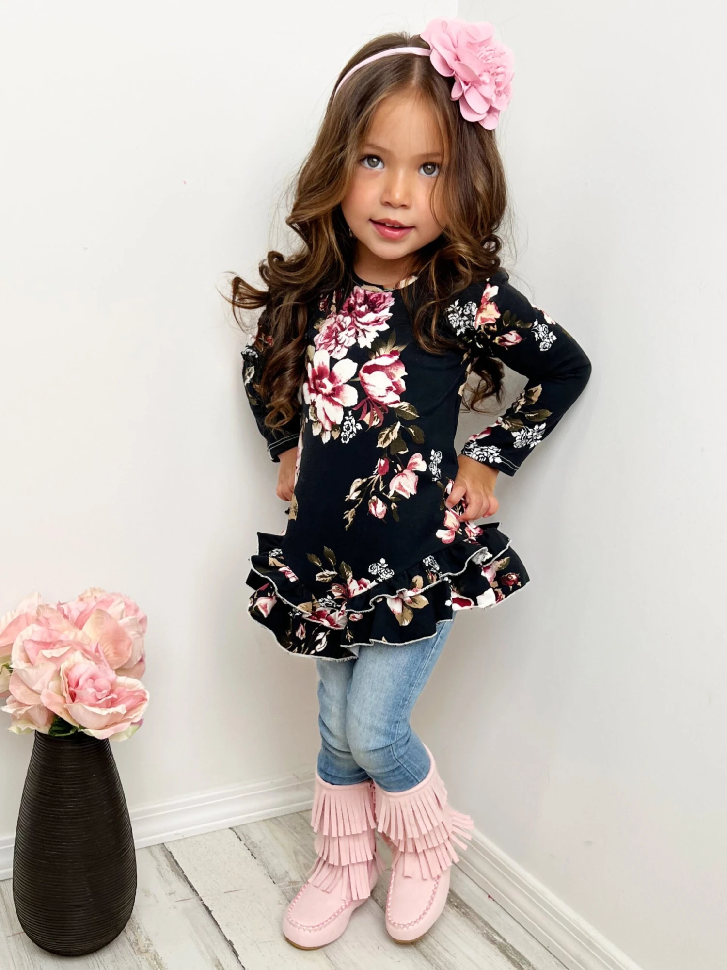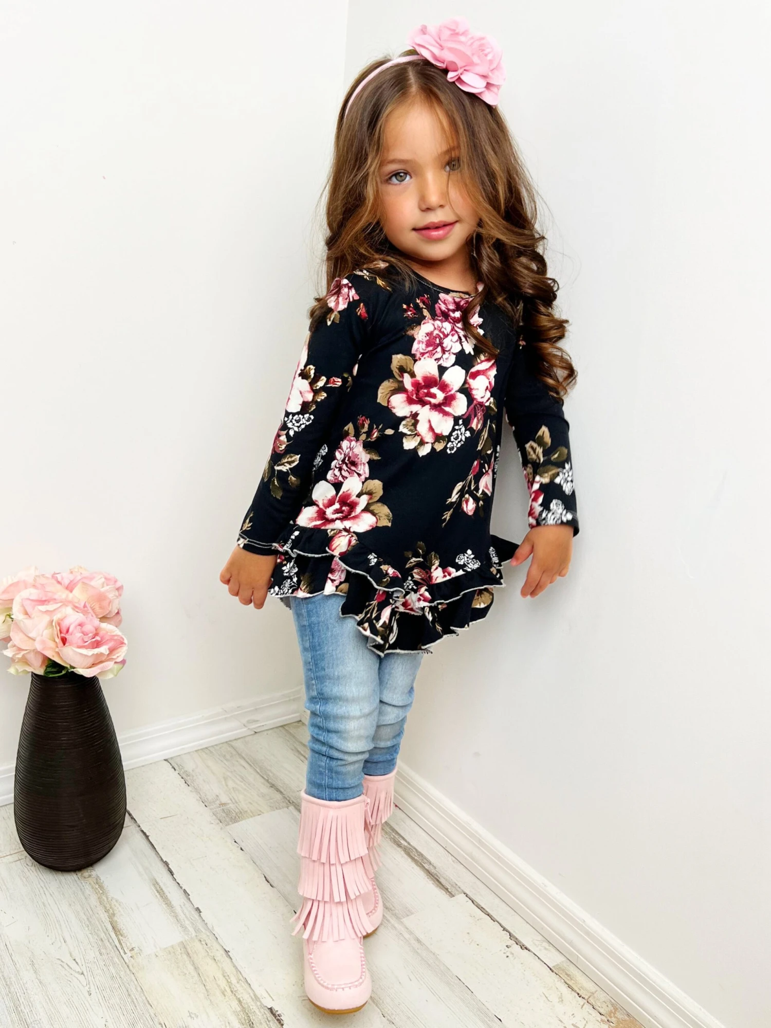 - Florals for fall? Yes, please! This pretty floral top is so perfect for your little darling. With its sophisticated mix of colors and cute blossoms, it’s sure to keep her looking classy and fun this season!