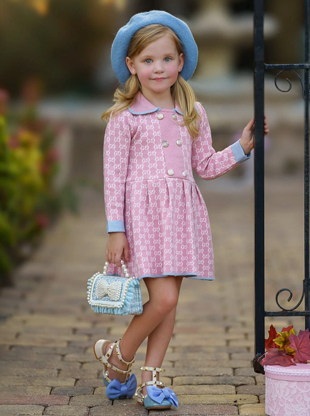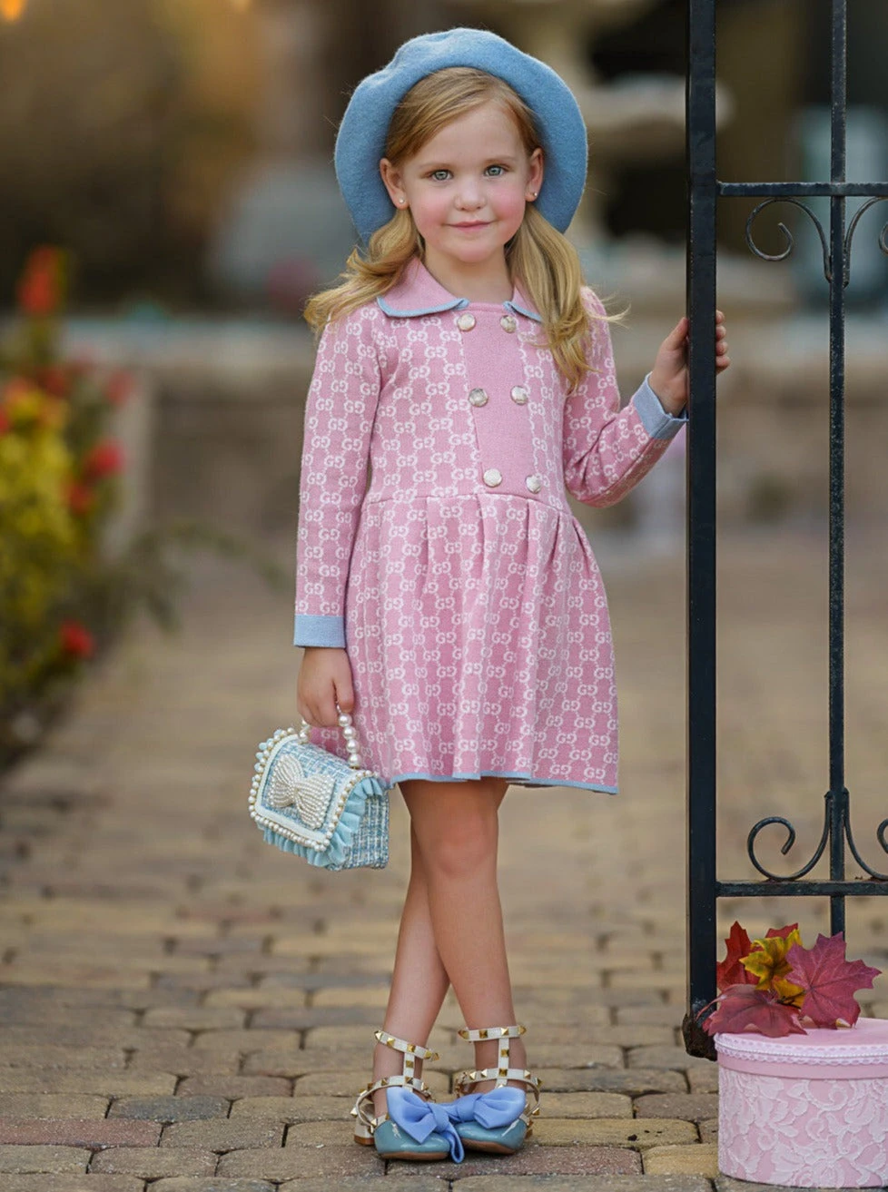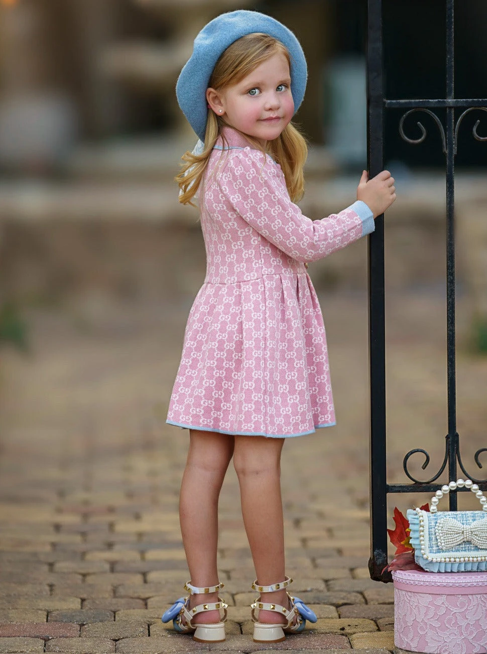 - Show off your little girl’s runway-worthy fashion with our stylish pink monogram dress. This long-sleeved number features contrast trimming, a flattering A-line skirt, and an all-over monogram logo design. Guaranteed to boost her style and confidence too!