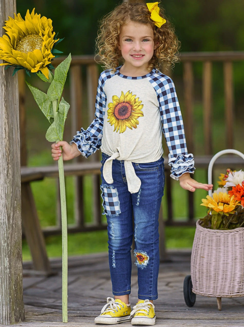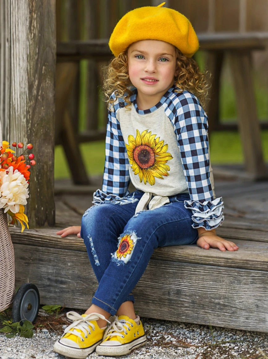 - Plaid raglan sleeve knot-hem top with tiered ruffle cuffs, sunflower print, and patched distressed jeansÂ