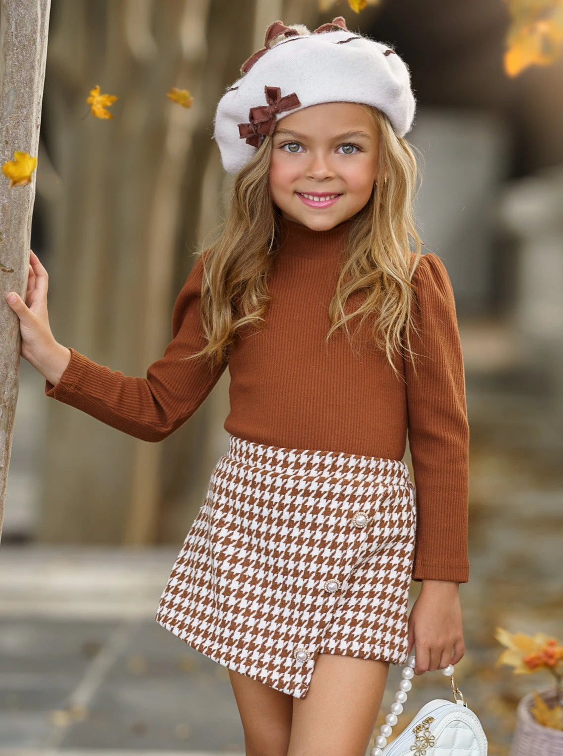 - Your little girl will be OOTD-ready in our brown turtleneck top and houndstooth skort set. The chic brown top is elevated by the houndstooth print bottom, serving the perfect mix of fall fashion. She’ll love posing for pics!Â