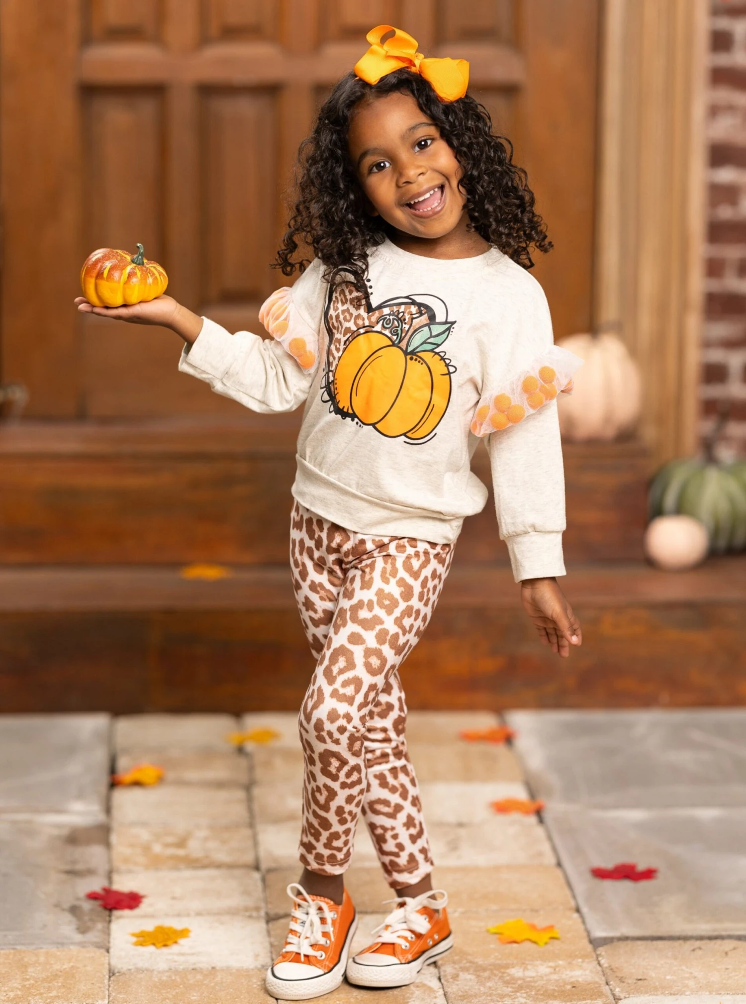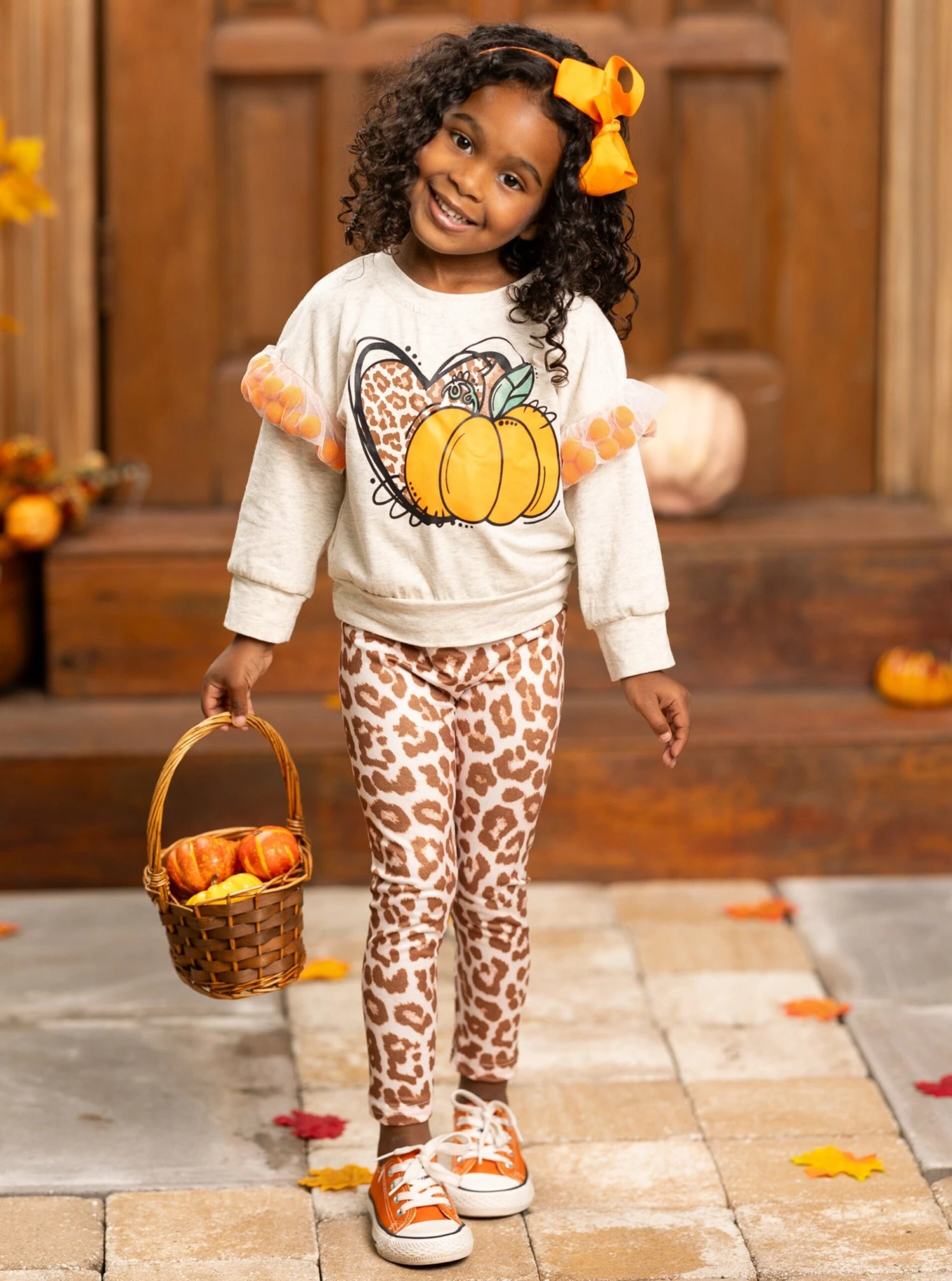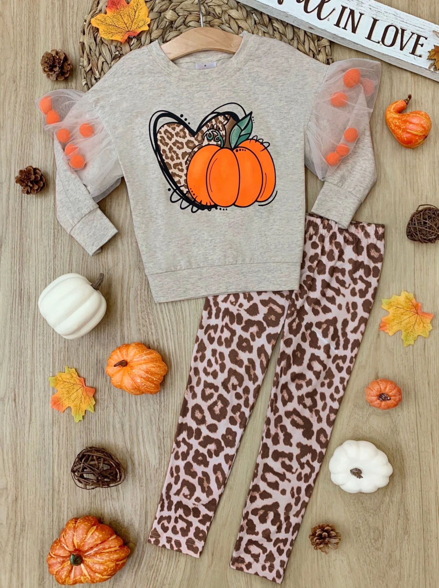 - Long-sleeve pullover top with leopard print heart and pumpkin graphic, pom-pom/mesh sleeve applique, and matching leopard print leggings