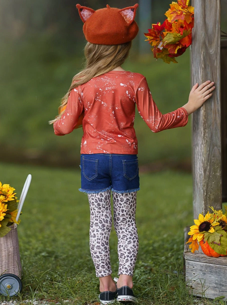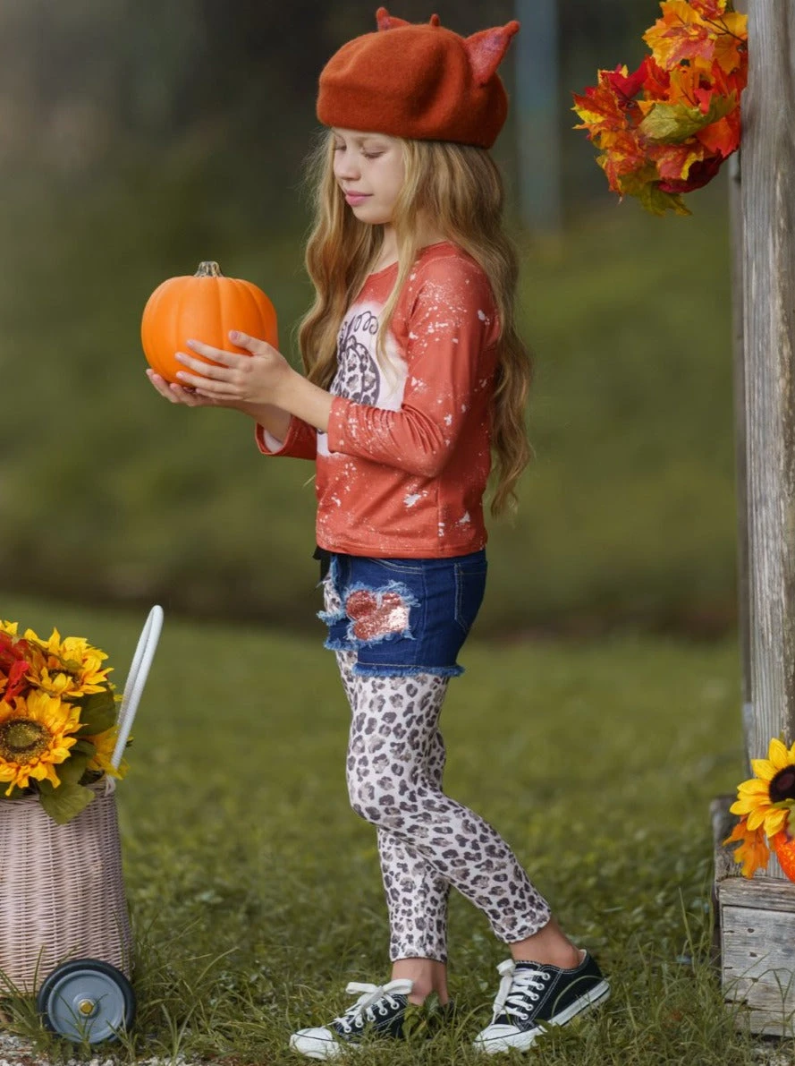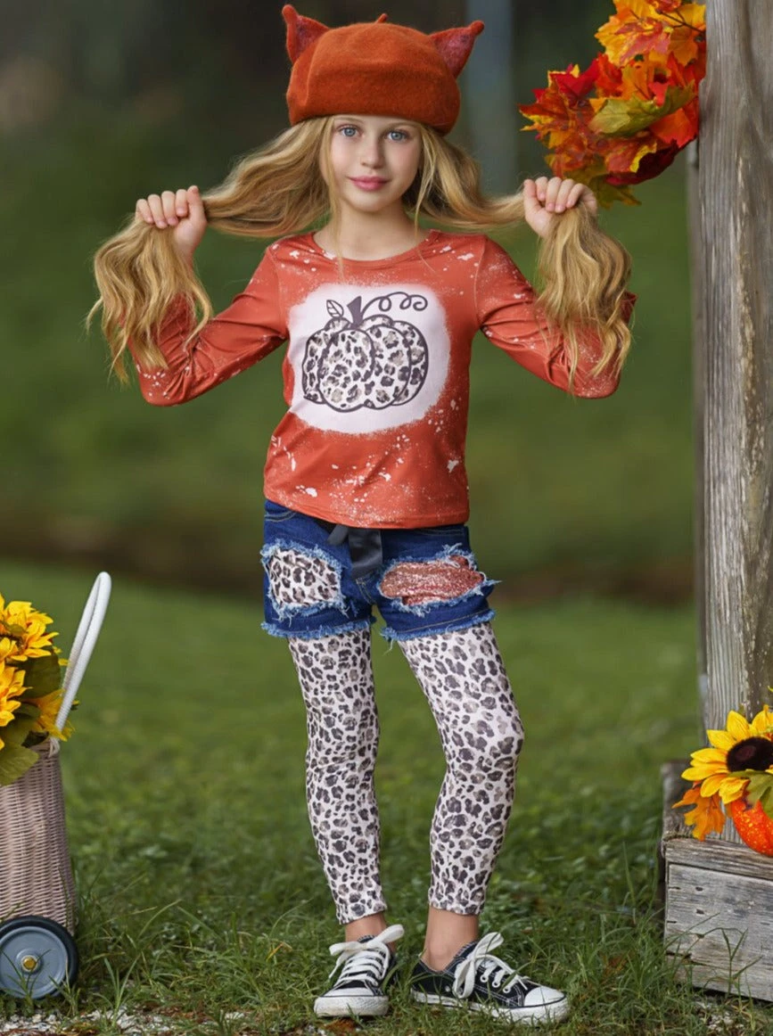 Posh Pumpkin Top, Patched Denim Shorts & Legging Set