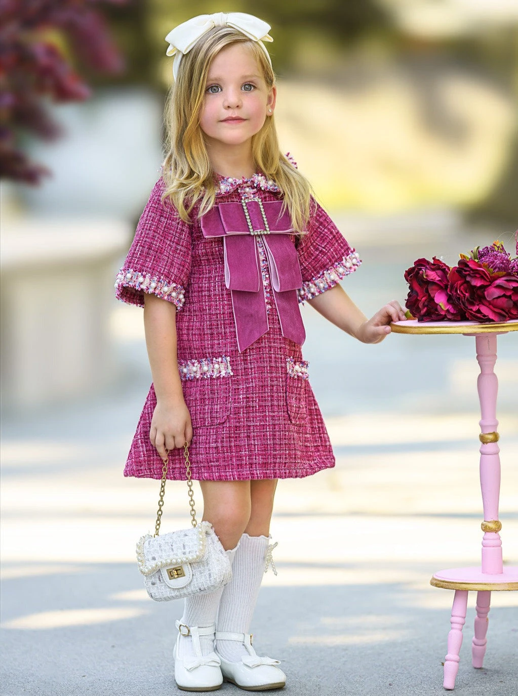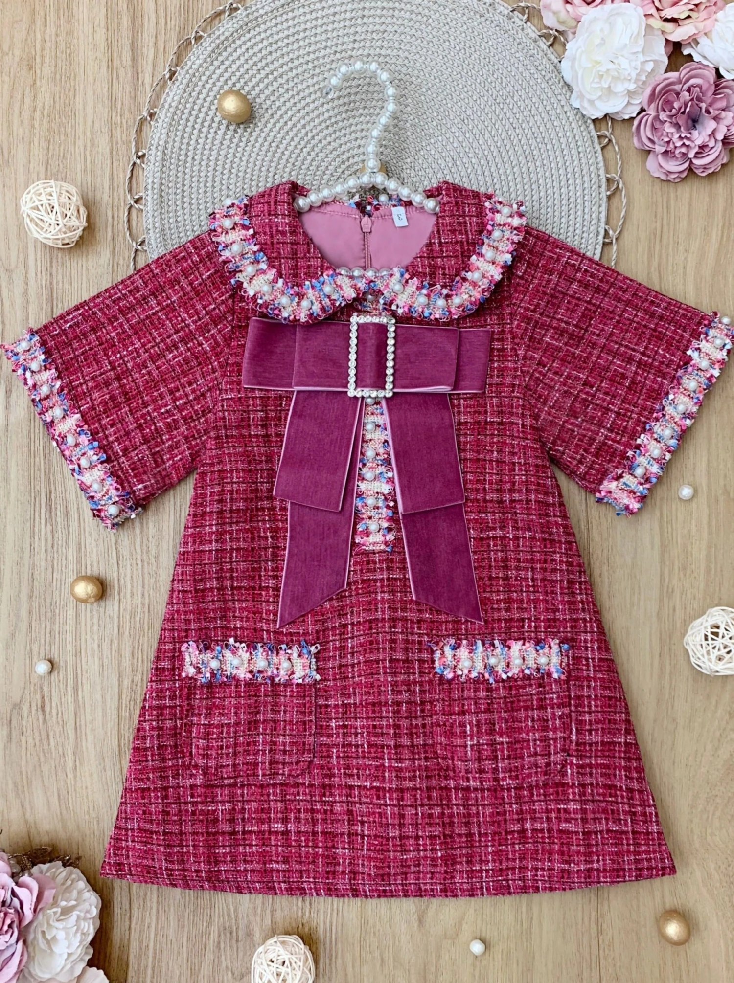 - Watch your little girl turn into an elegant doll in our berry red tweed dress! With its sophisticated fabric, flattering A-line fit, and elegant bow detail, this fashionista must-have is sure to make her look prim and polished!