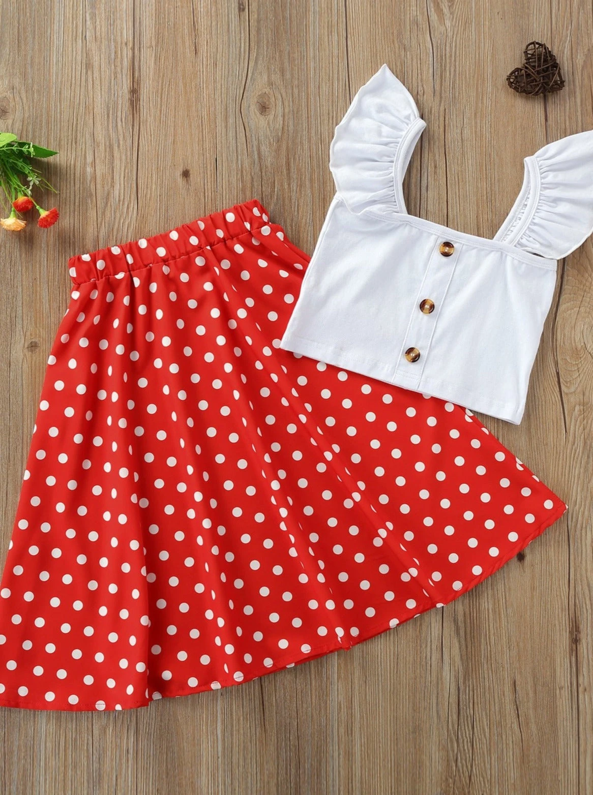 - How about a precious polka dot skirt set for your princess? Look at those angelic flutter sleeves! She’ll pose up a storm and twirl the day away in stylish grace!