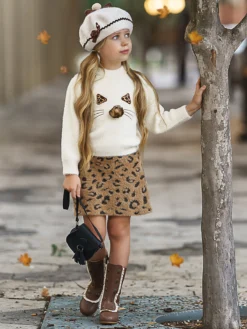 Girls Ready To Go Long-Sleeved Polka Dot Top And Plaid Skirt Set