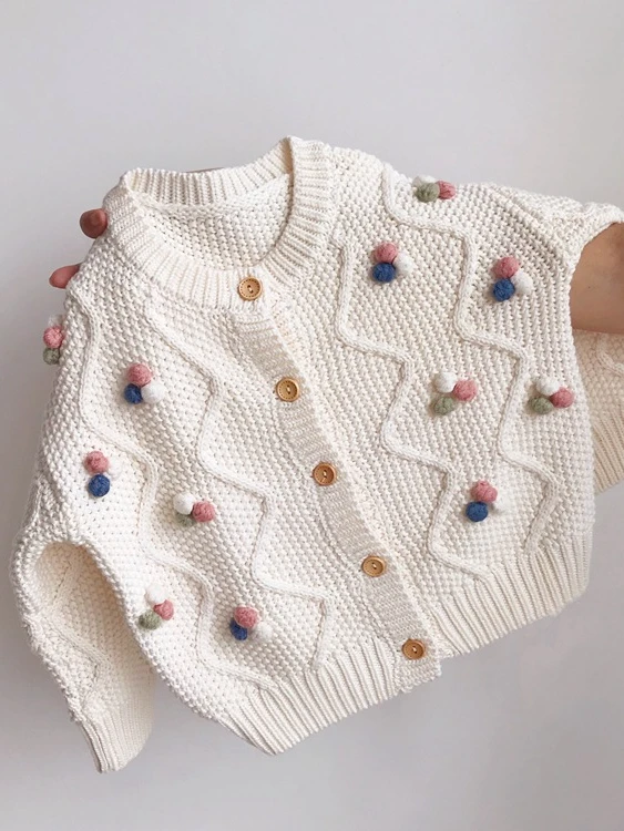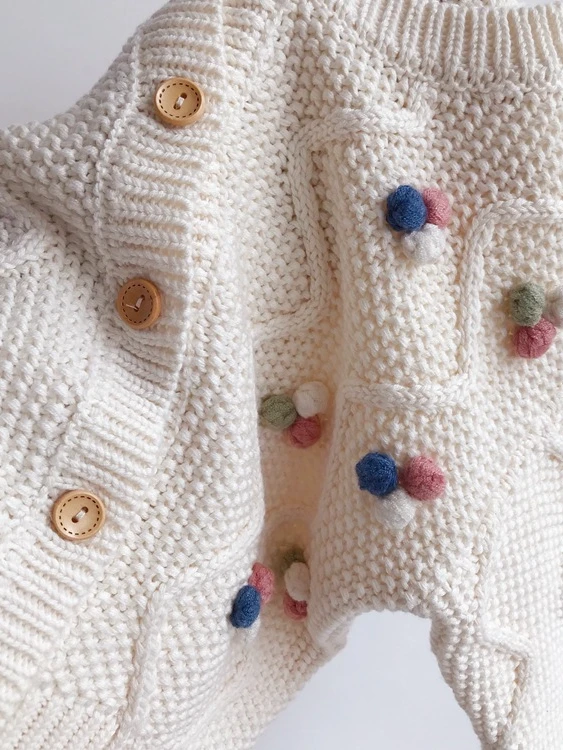- Your baby will always be snuggle-worthy! Especially when she’s wearing our cozy knit cardigan. Its stylish knit is adorned with adorable multicolor pom-pom details, adding a splash of fun to her cold-weather look.Â