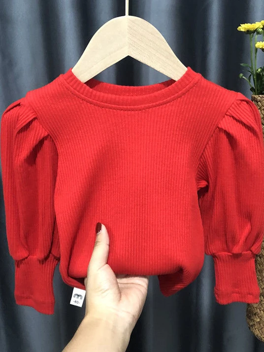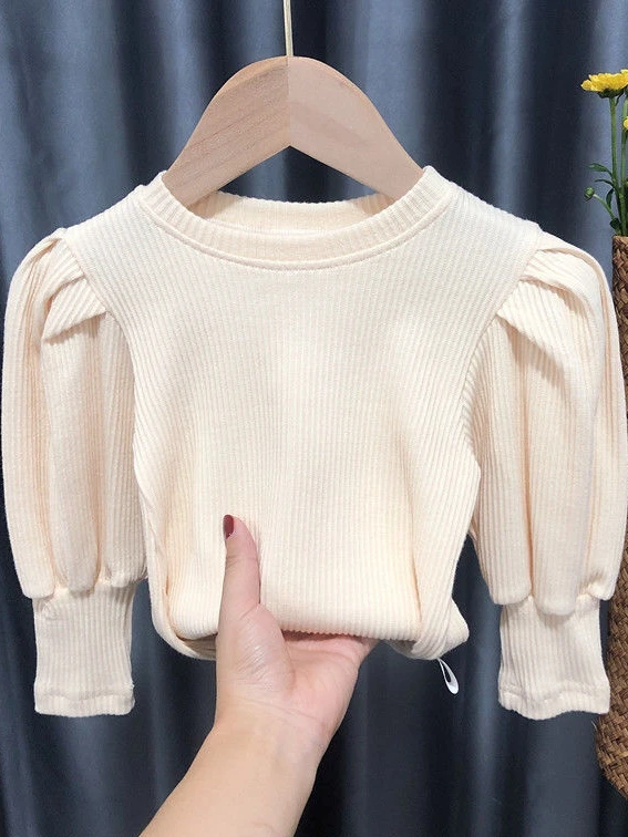 - Long-sleeve ribbed knit sweater with puff shoulders