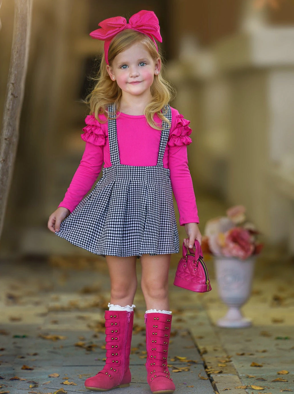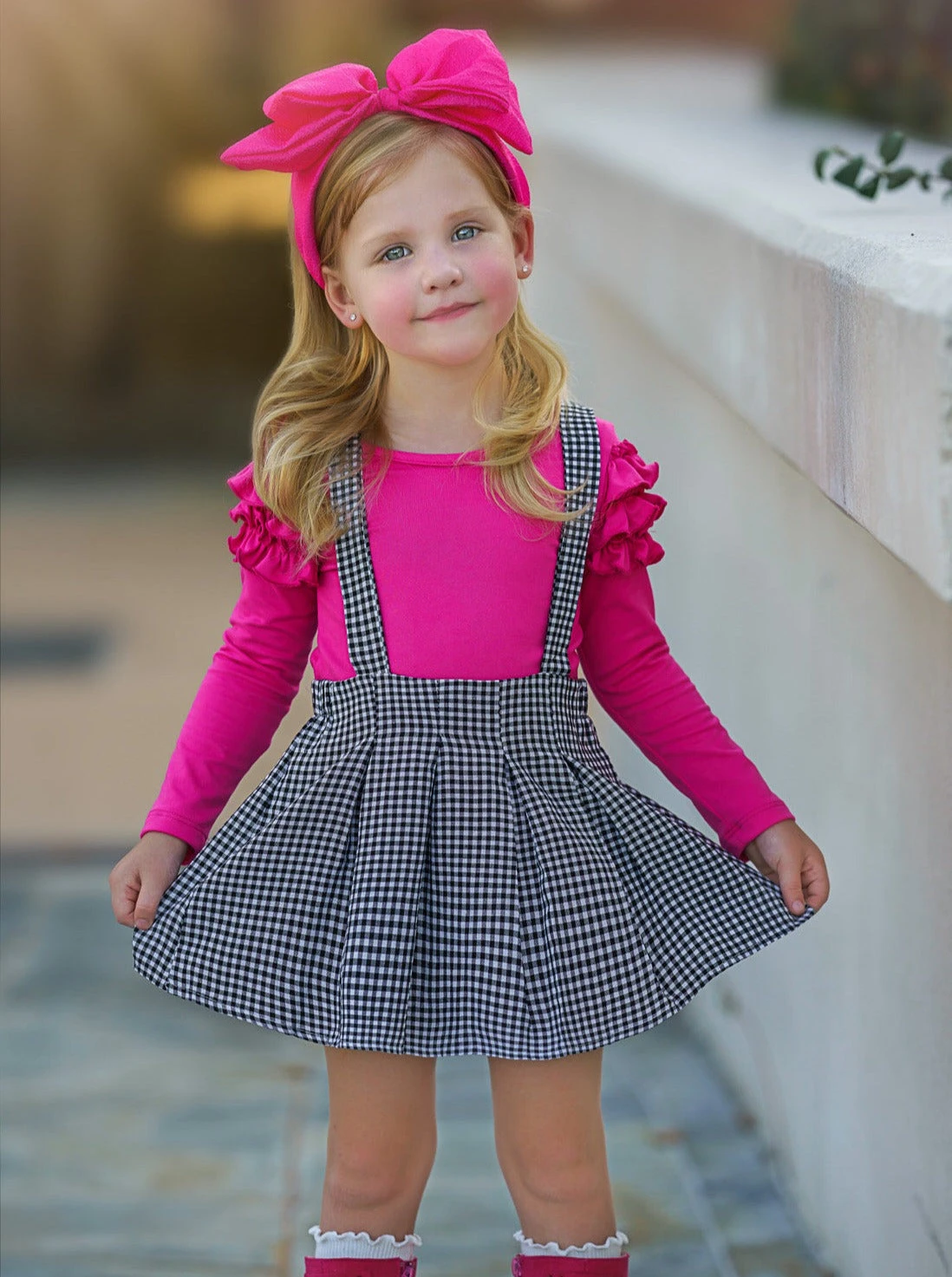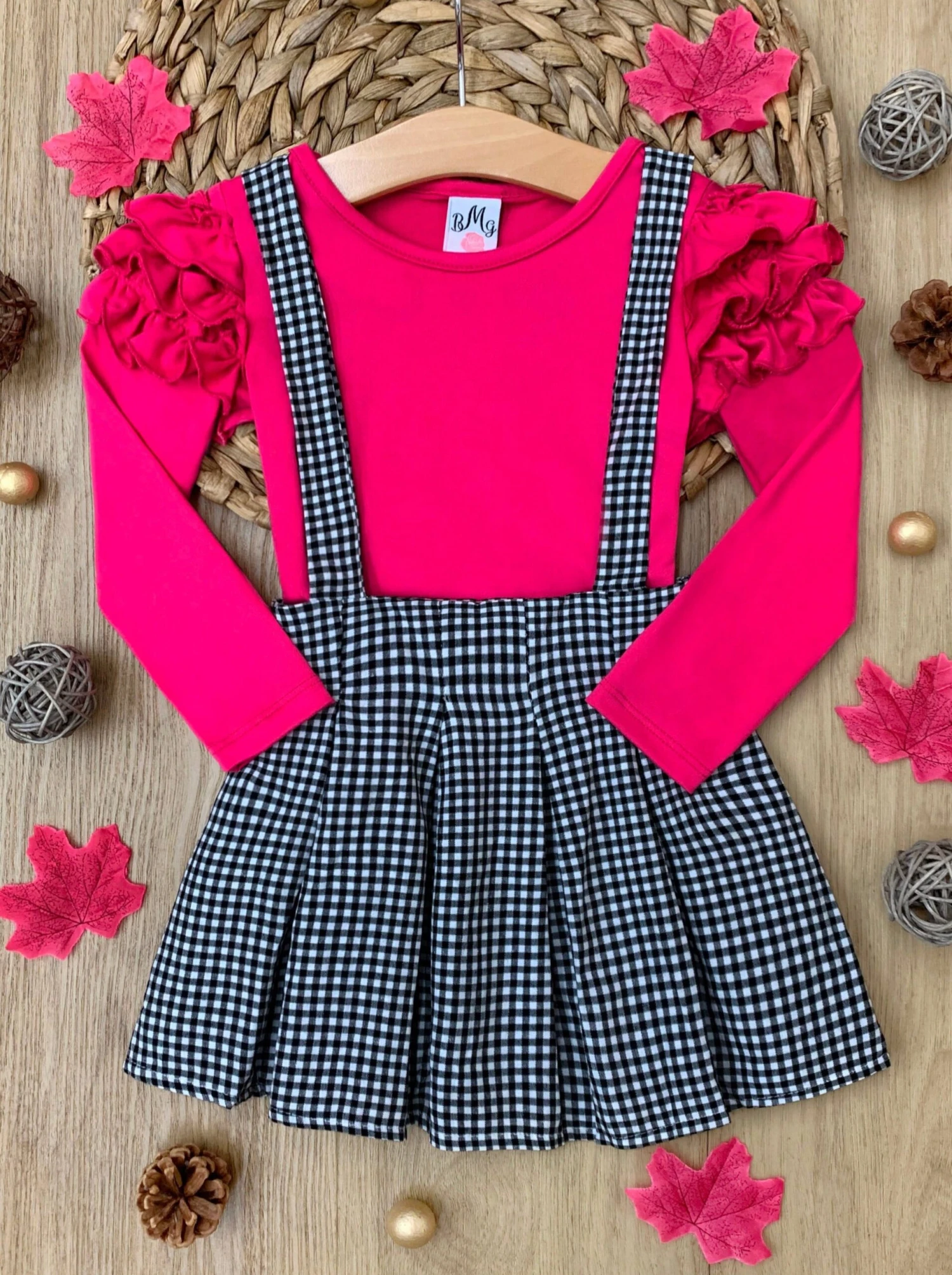 - Fuchsia long-sleeve top with ruffle details and Gingham pleated suspendor skirt set