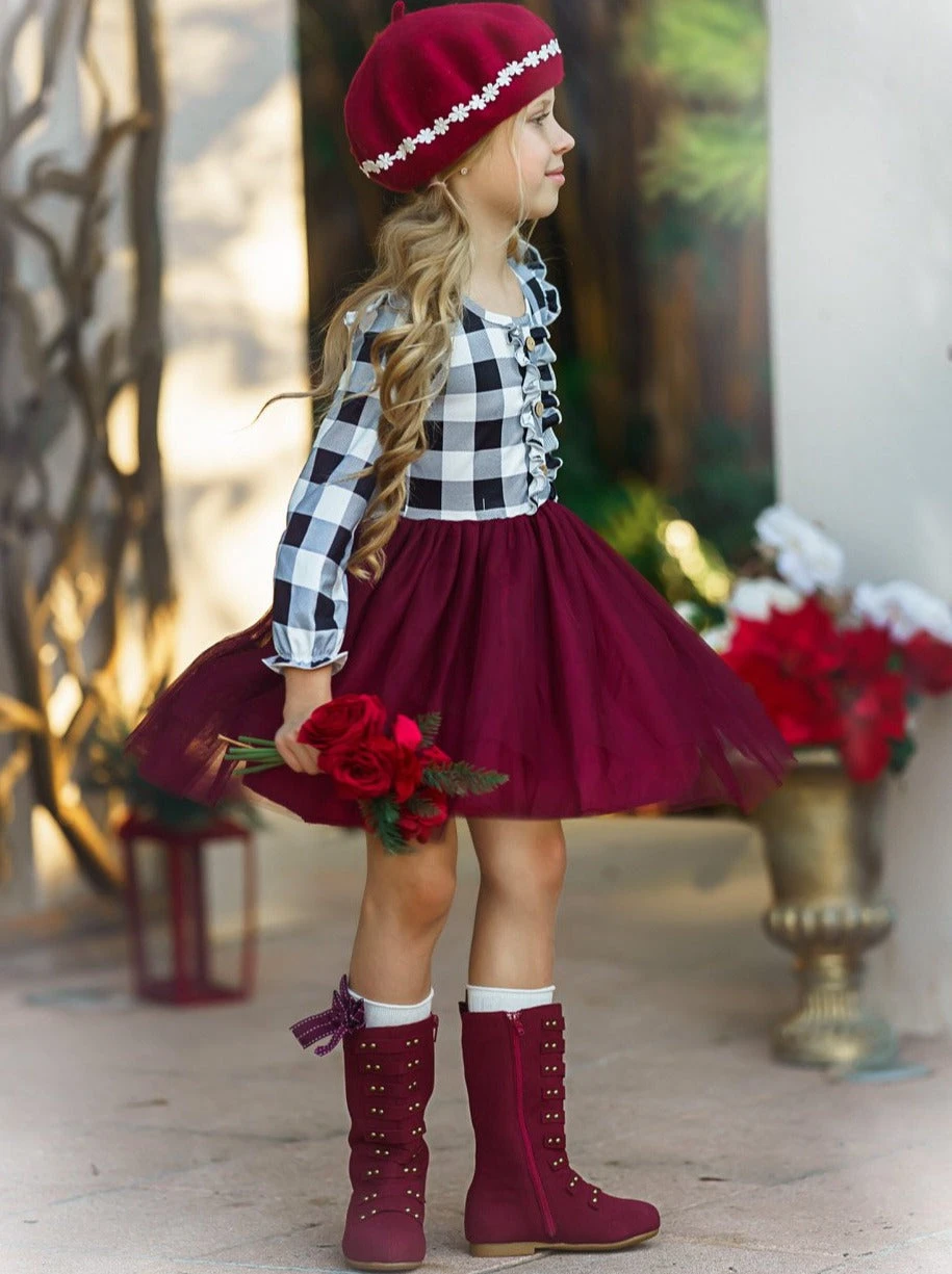 - Long-sleeve tutu dress with checkered plaid ruffle bodice, shoulders, cuffs, and gathered tulle skirt