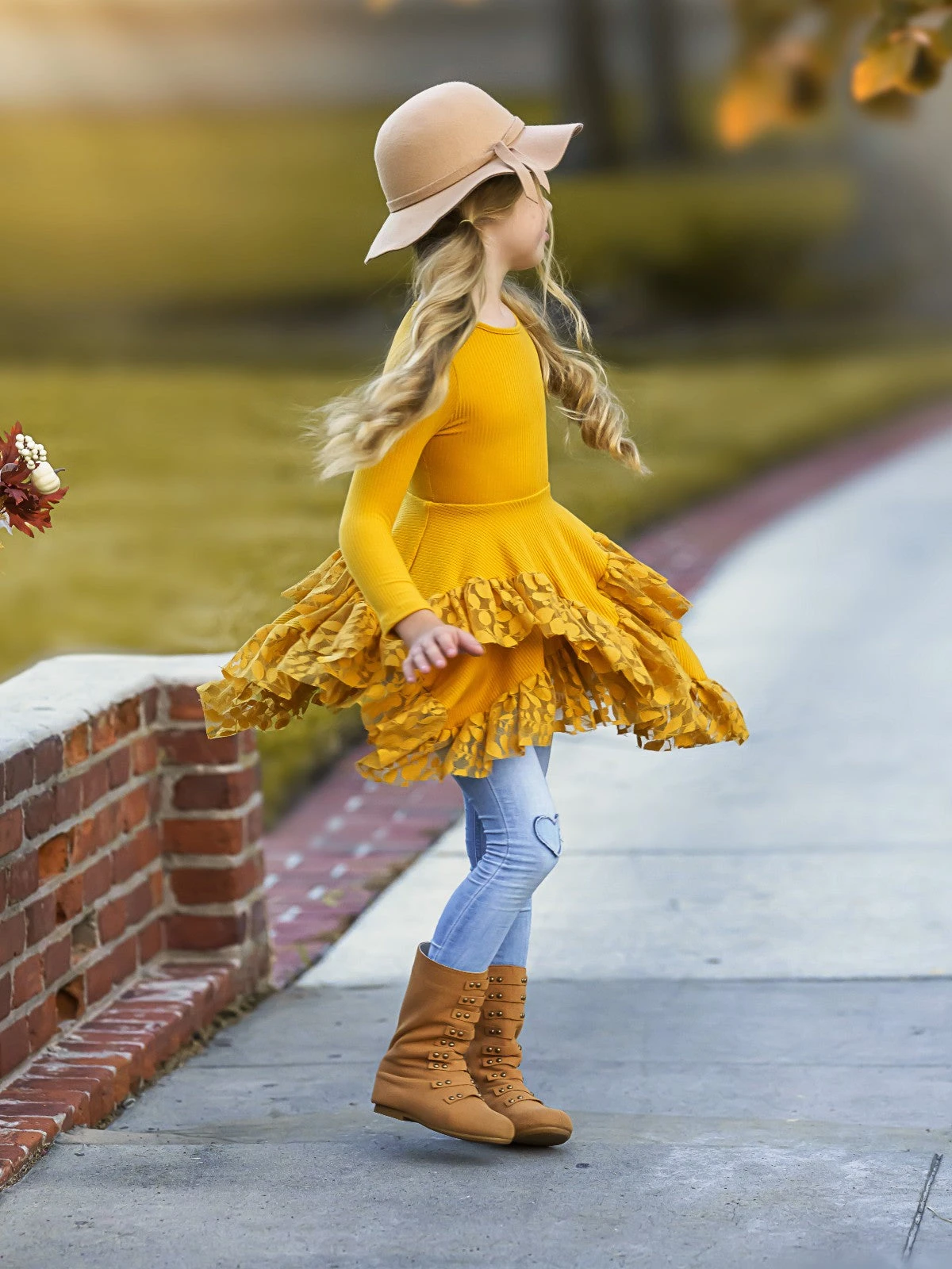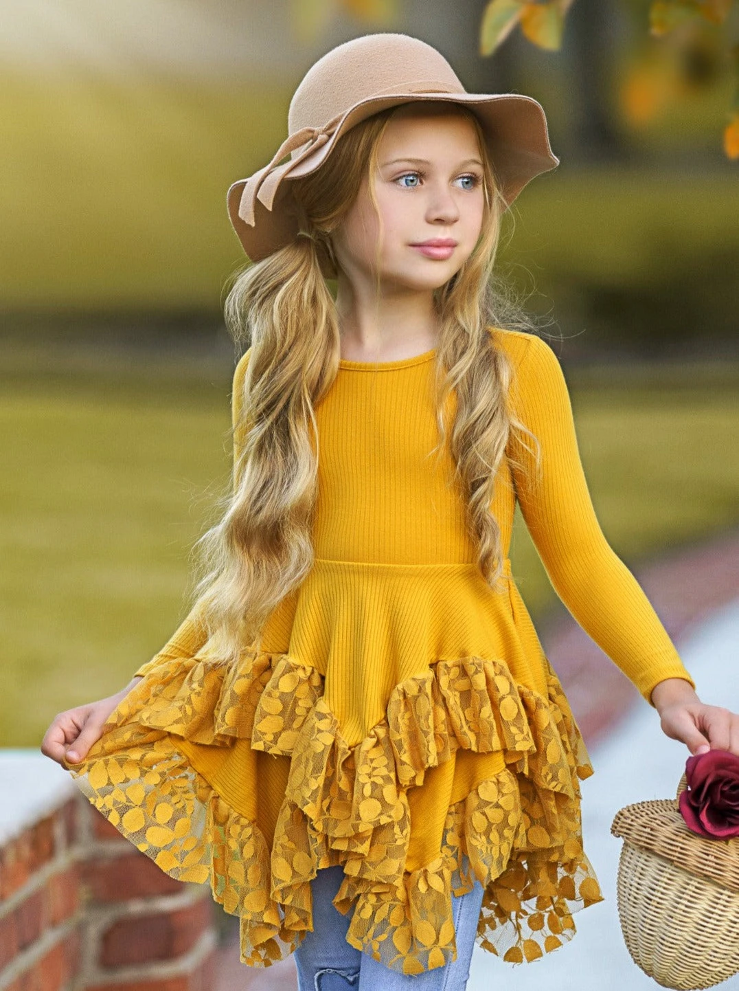 - Delight budding fashion mavens with this darling top that features a trend-savvy ruffled tunic dress. Lace details add a delicate and charming touch to your girl’s look!Â