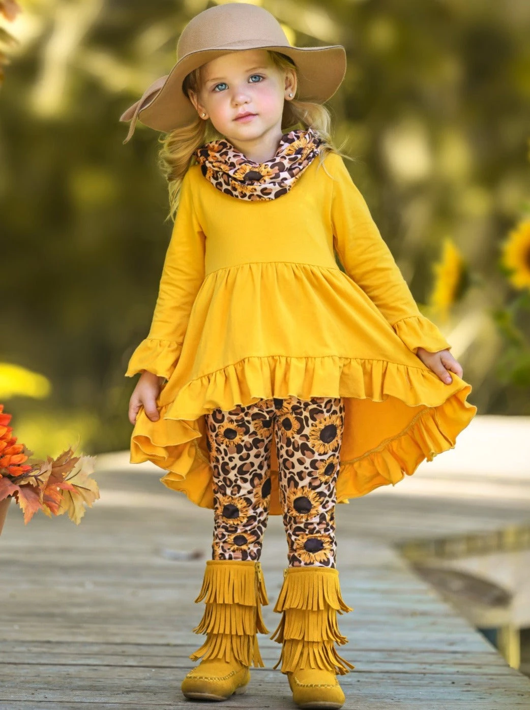 - Our sunflower leopard print three-piece legging set is perfect for Fall! The flowy ruffle tunic, matching leggings and scarf, and festive design makes getting dressed easy and looking cute effortless.