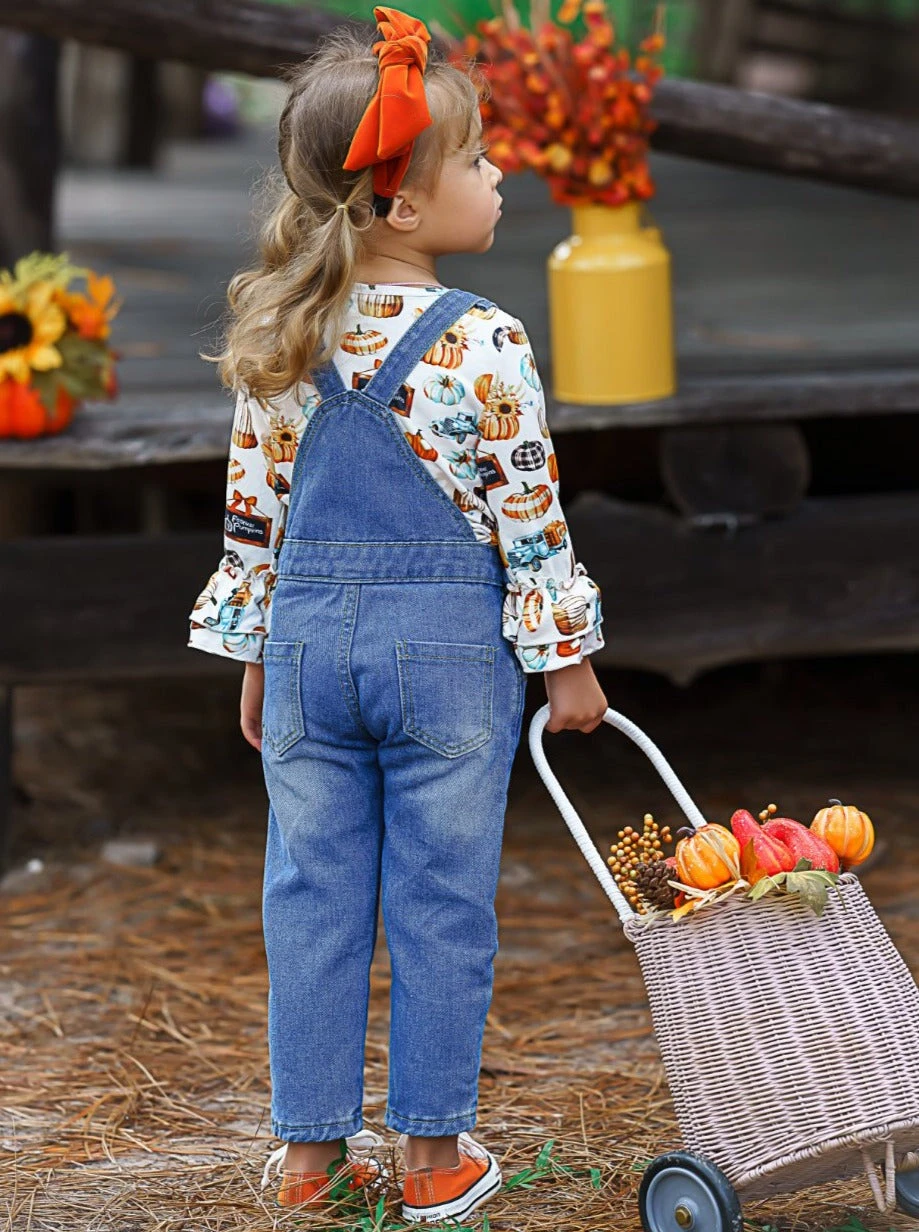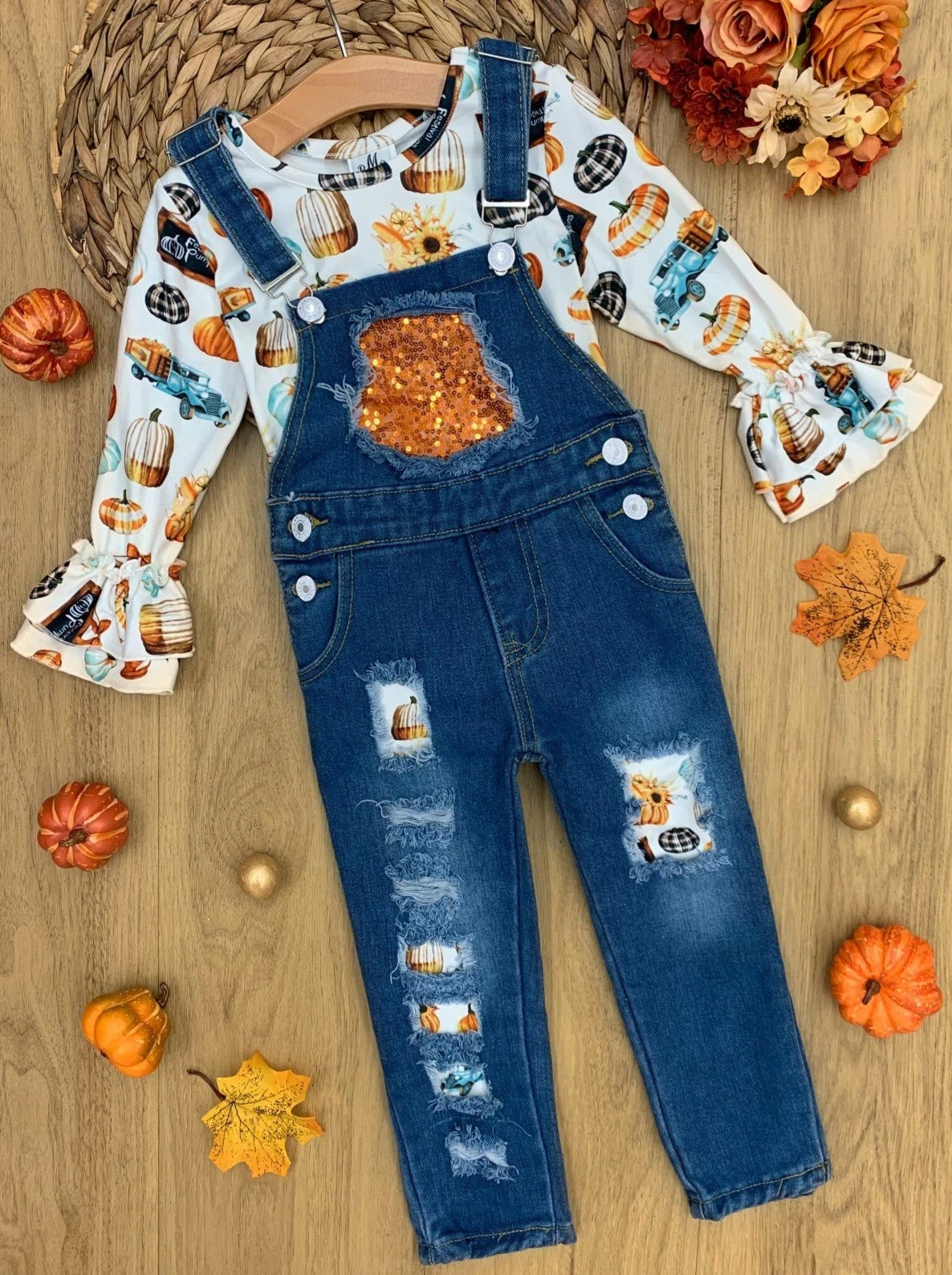 - Give your precious pumpkin the patched overalls set she deserves this fall. Complete with sequin sparkle, she’ll want to wear it everywhere!