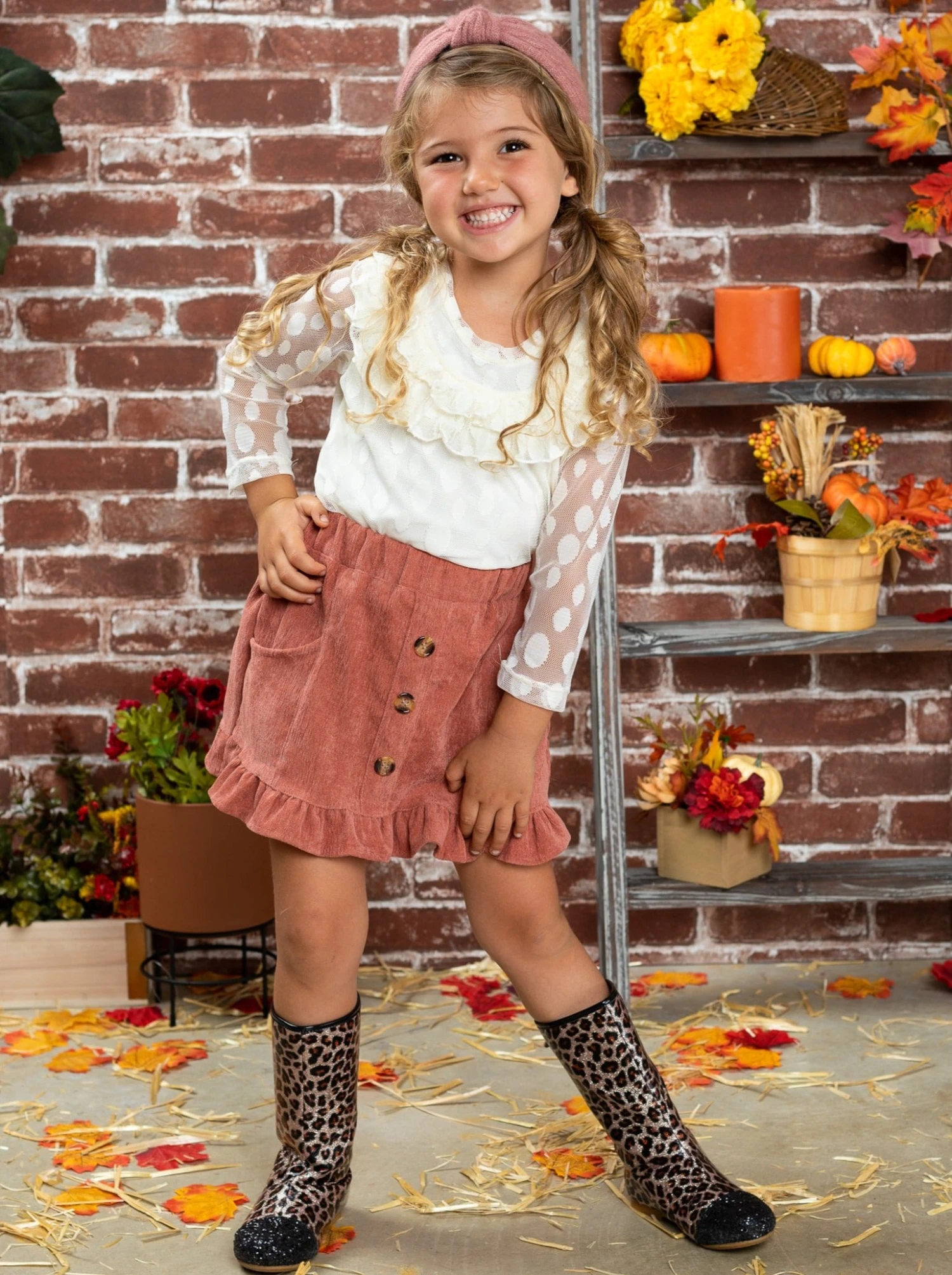- Long-sleeve swiss tulle polka dot top with ruffle bib and faux button velvet skirt with ruffle hem and pockets