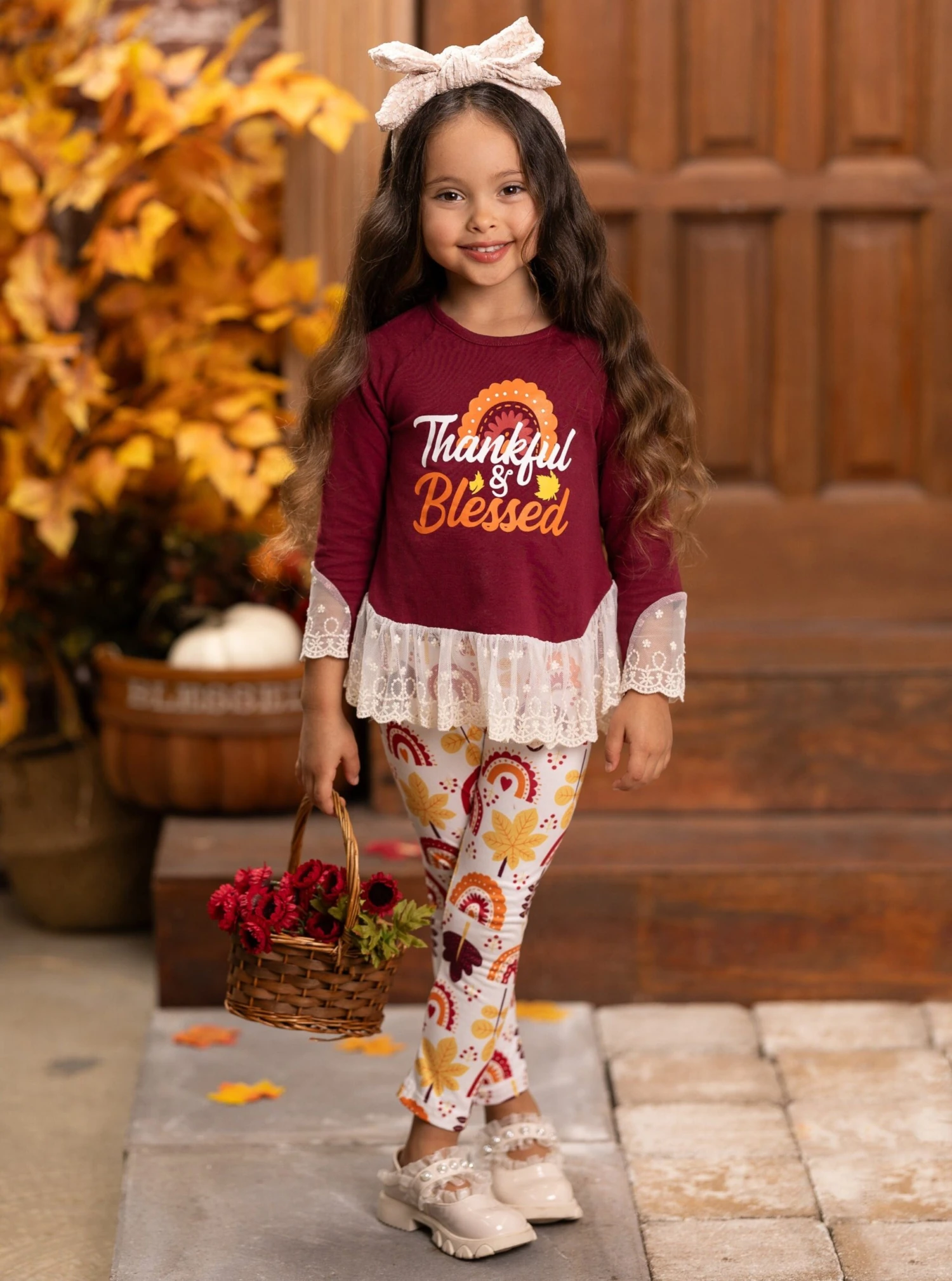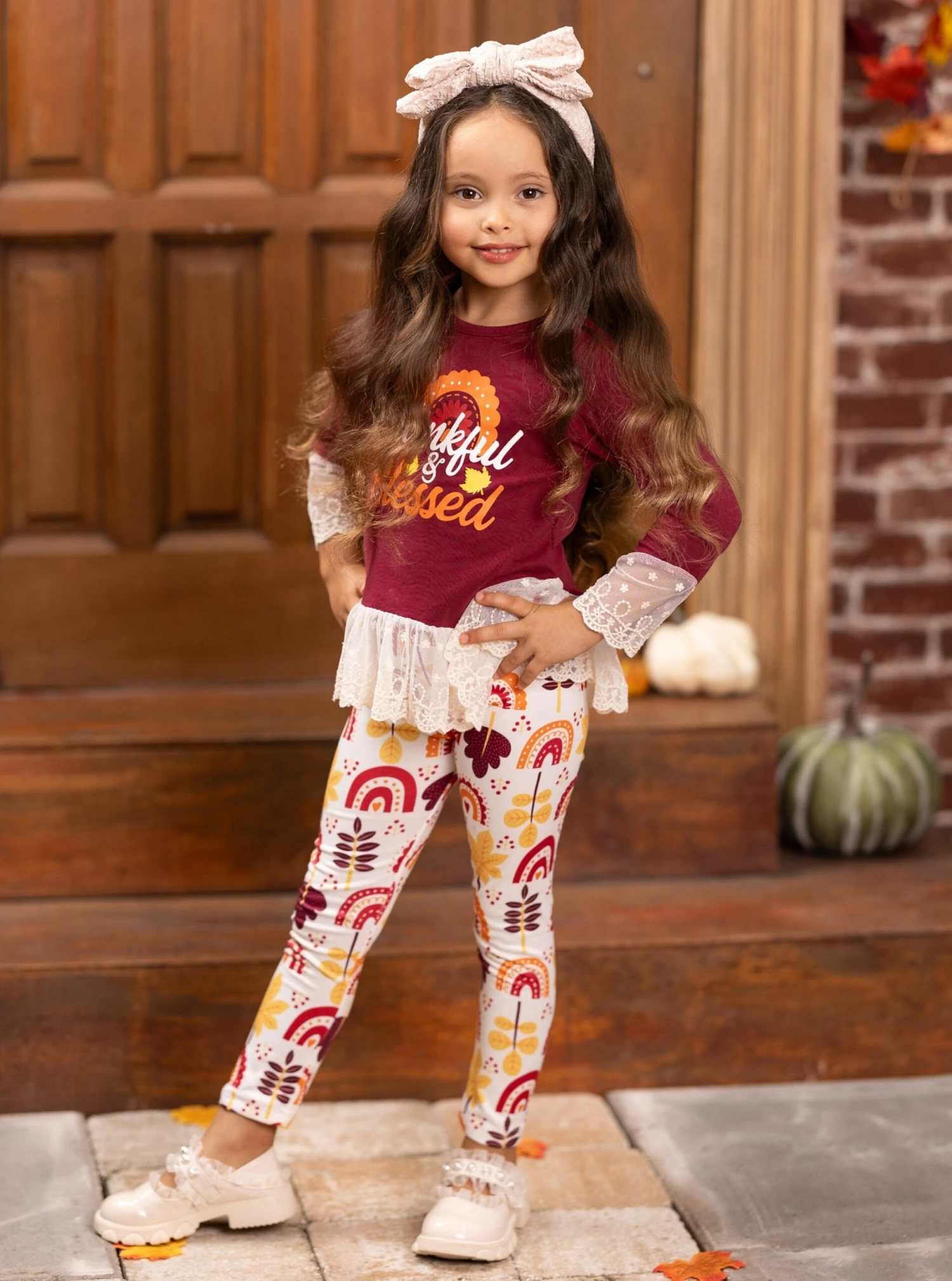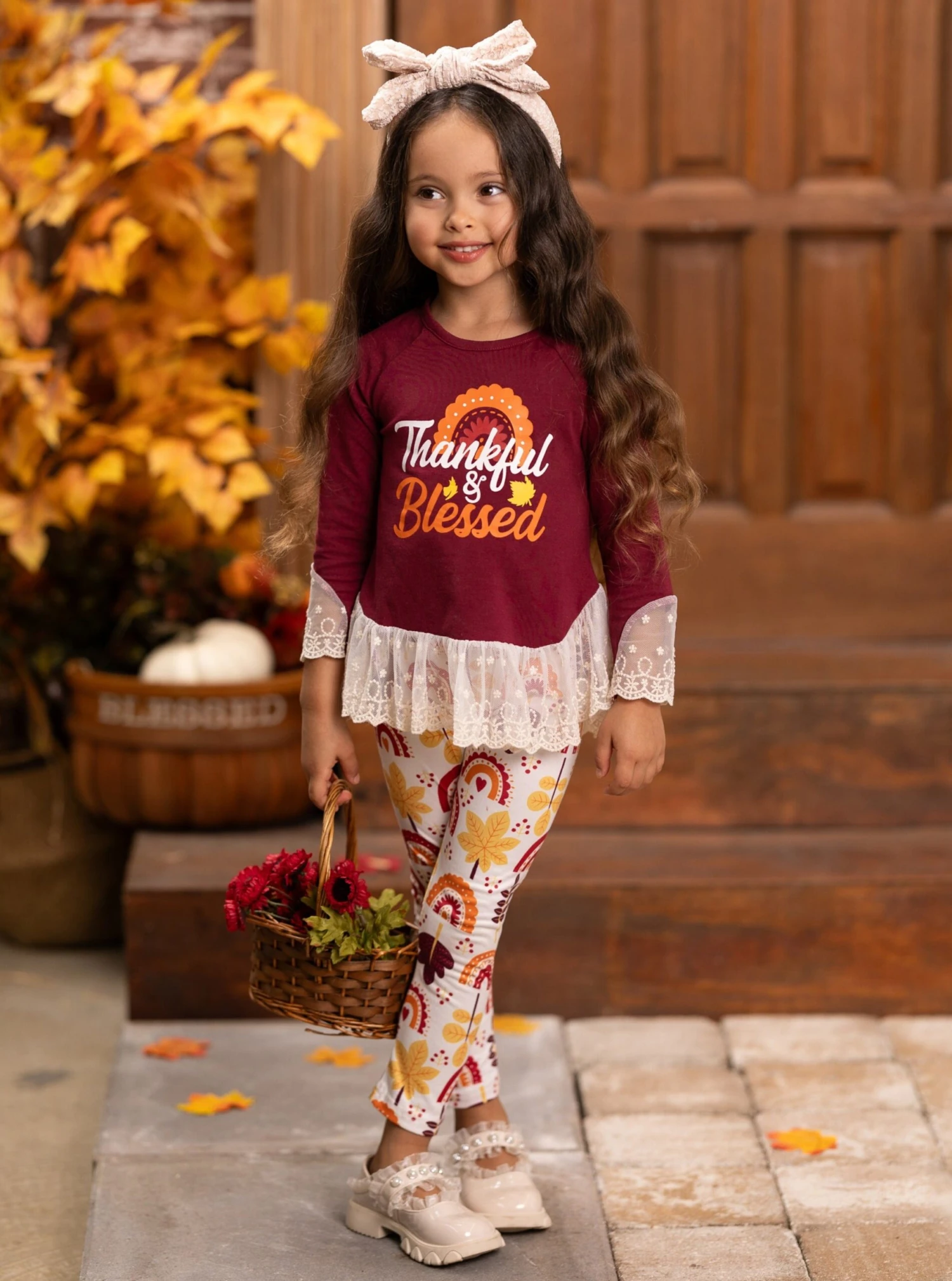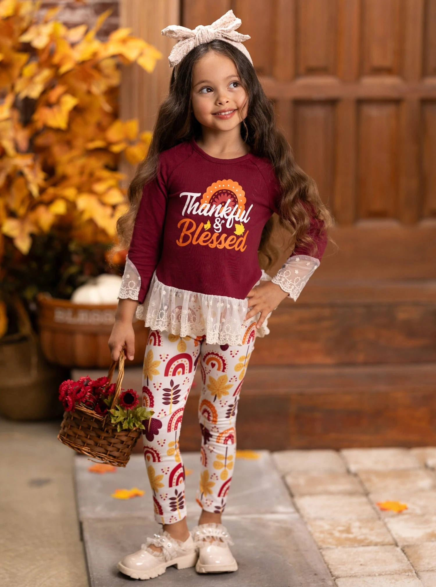 Perfect for fall, Thanksgiving, classroom parties, pumpkin patches, and picture day - Long-sleeve tunic with “Thankful & Blessed” turkey graphic, embroidered cuffs and ruffle hem, and turkey-themed print leggings