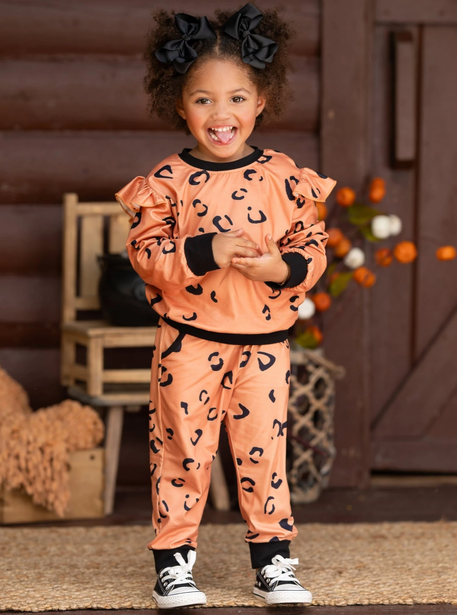 - She’s tiny but fierce in this purrrfectly trendy loungewear set! Your little girl will be styled in a flash with our sweatshirt and jogger pants crafted from lightweight cotton fabric and given a fun leopard print. It’s even got roomy pockets and darling ruffles. How can you resist?