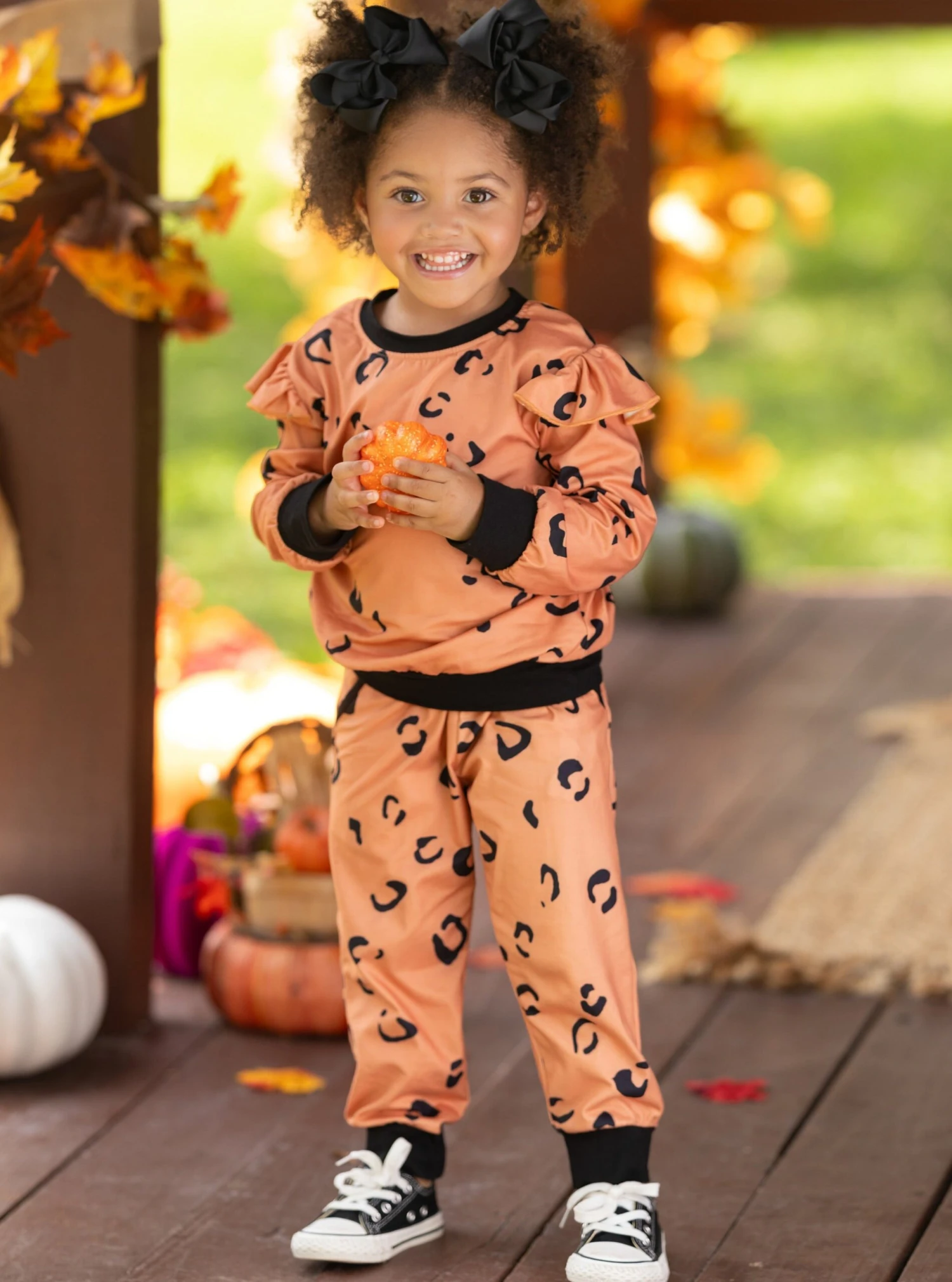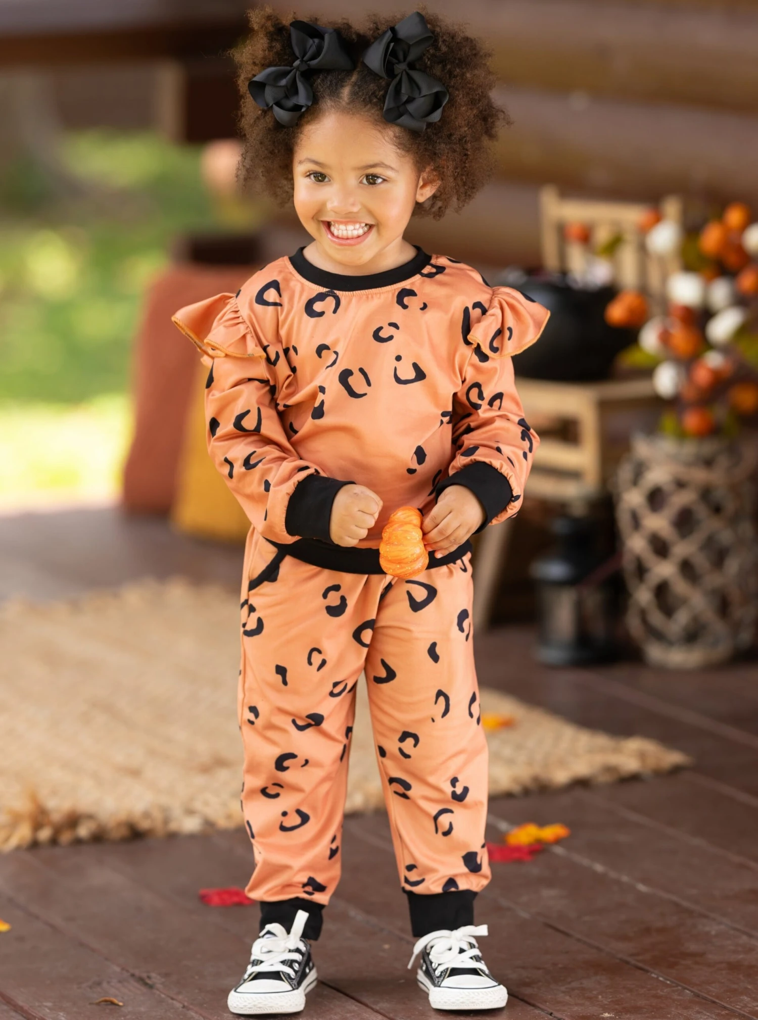 - Long sleeve sweatshirt with black trim, leopard print, ruffle shoulders, and matching jogger pants with pockets